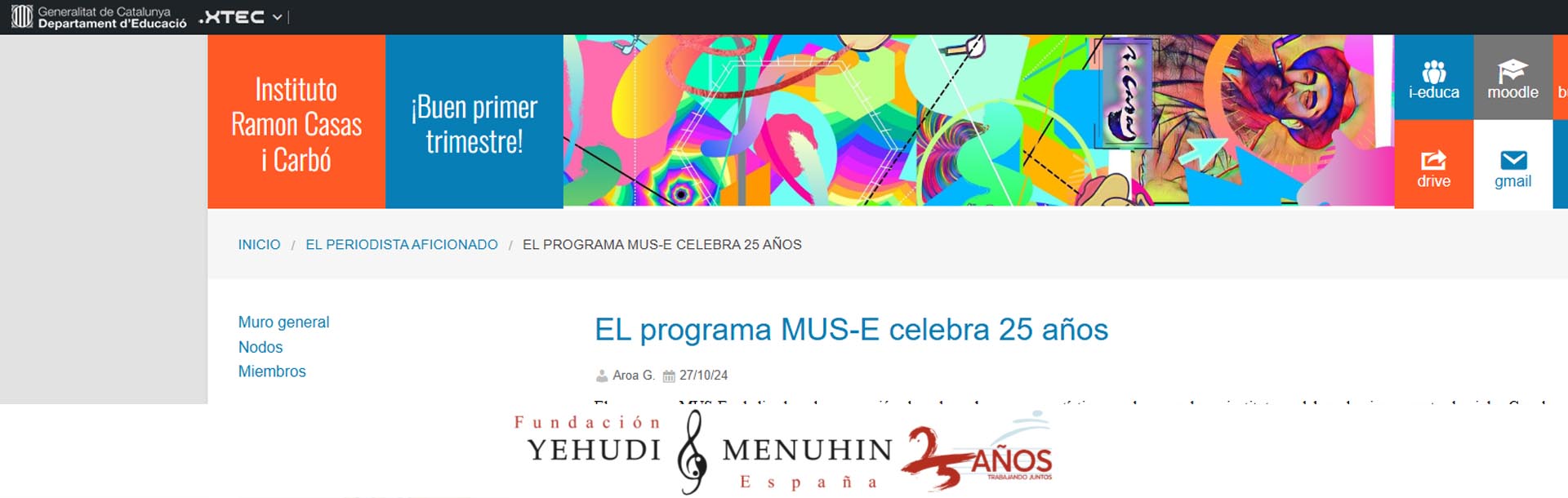 En estos 25 años, muchas han sido las colaboraciones, sinergias y contactos establecidos entre la Fundación Yehudi Menuhin España y diferentes entidades, asociaciones, instituciones y un largo etcétera de actores sociales. Sin duda, los centros escolares son la piedra angular de nuestros programas, tanto por estar dirigidos a sus alumnos y alumnas como por la colaboración que obtenemos de ellos que nos permiten mejorar y ampliar nuestros horizontes. Es por ello que nos complace poder compartir la reseña que uno de ellos nos ha dedicado, el Institut Ramon Casas i Carbó de Cataluña, región en la que desarrollamos nuestros programas desde hace muchos años. Al estar el original en catalán, os dejamos a continuación la traducción: