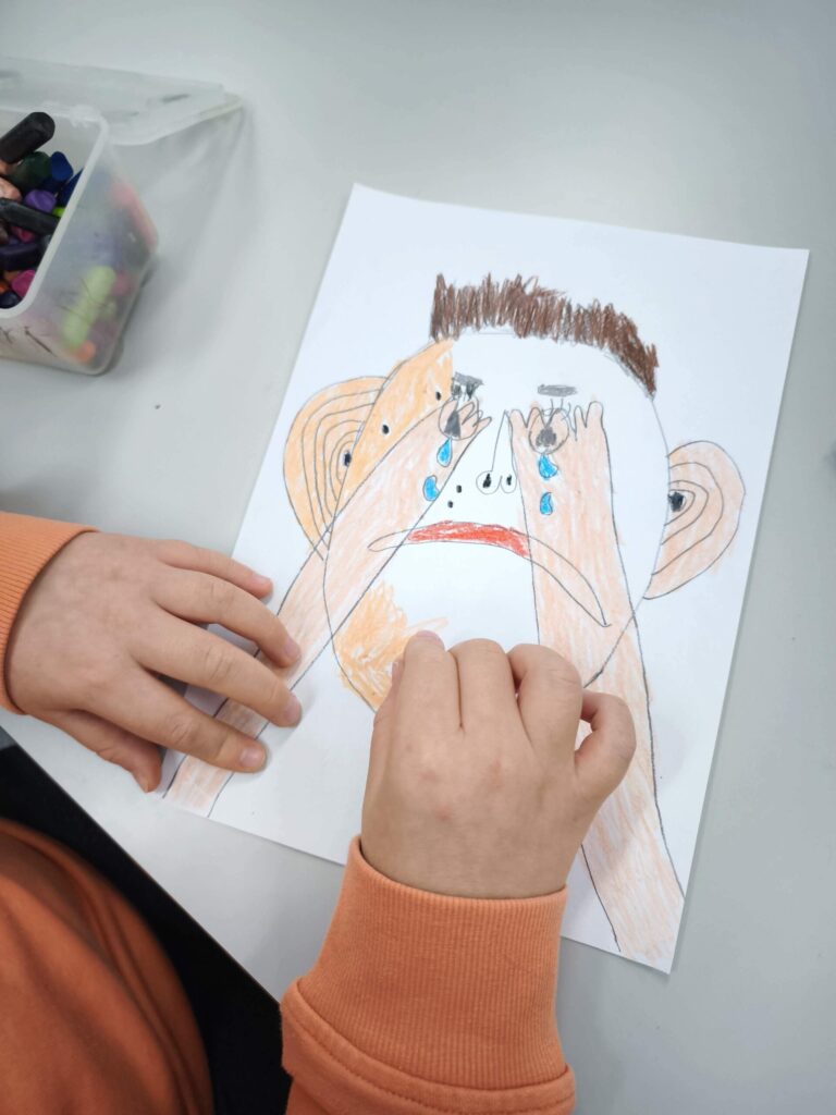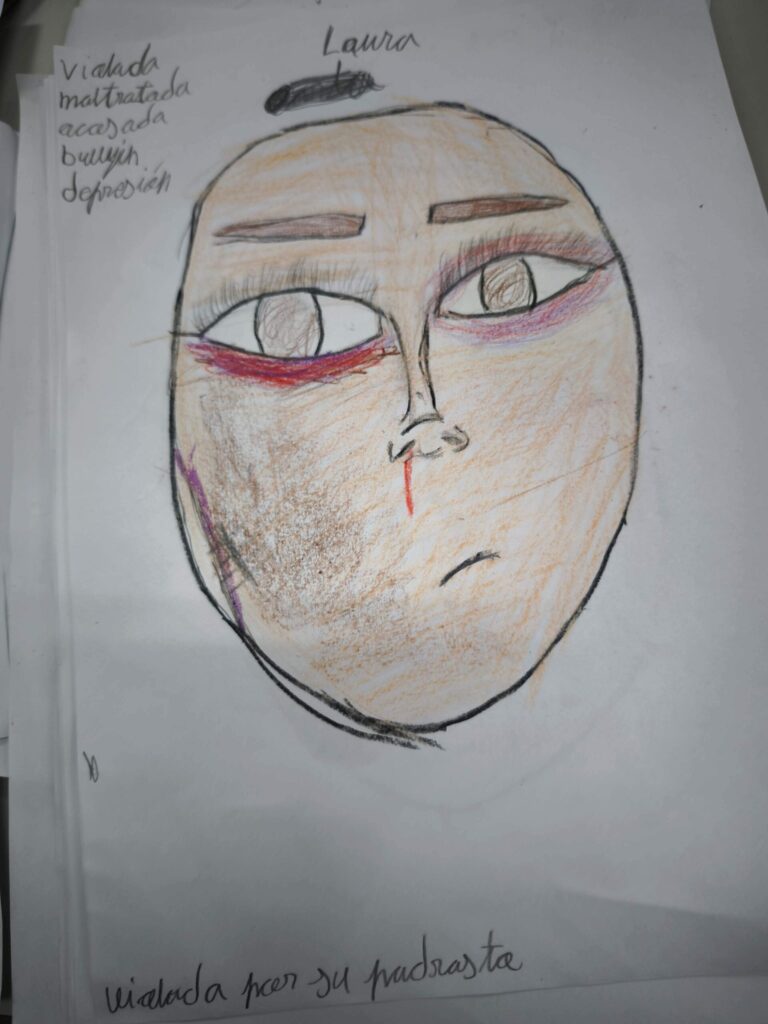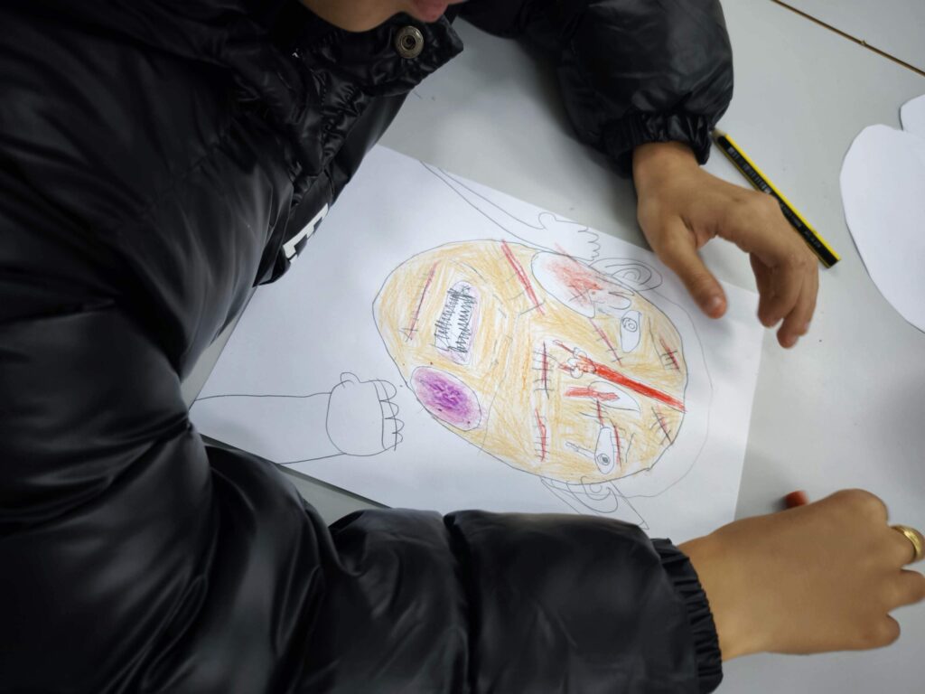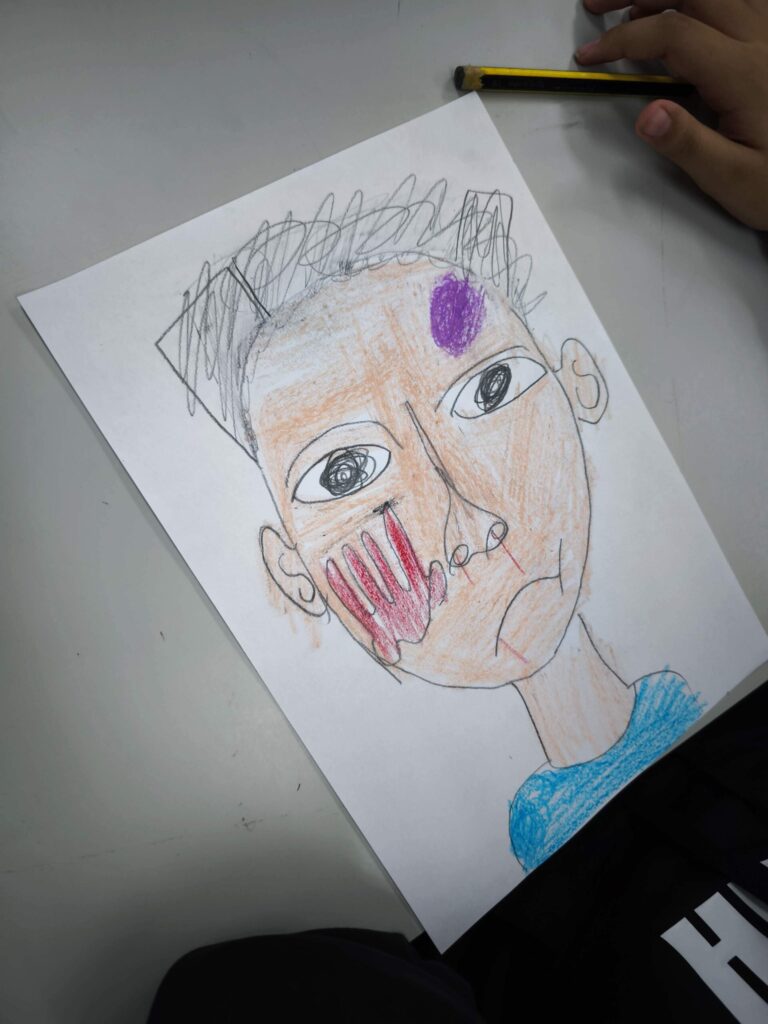 ¿Qué puede expresar una cara cuando no utilizamos palabras? A partir de ahí, los niños y niñas comenzaron a dibujar siluetas que fueron completando con colores, trazos y detalles que evocan emociones y vivencias. En las imágenes se observa cómo cada uno y cada una se concentró en construir un rostro marcado por señales simbólicas como cicatrices o lágrimas, que representaban así la realidad que sufren muchas mujeres en todo el mundo. El dibujo se convirtió en un espacio para pensar, sentir y exteriorizar aquello que a veces cuesta decir.