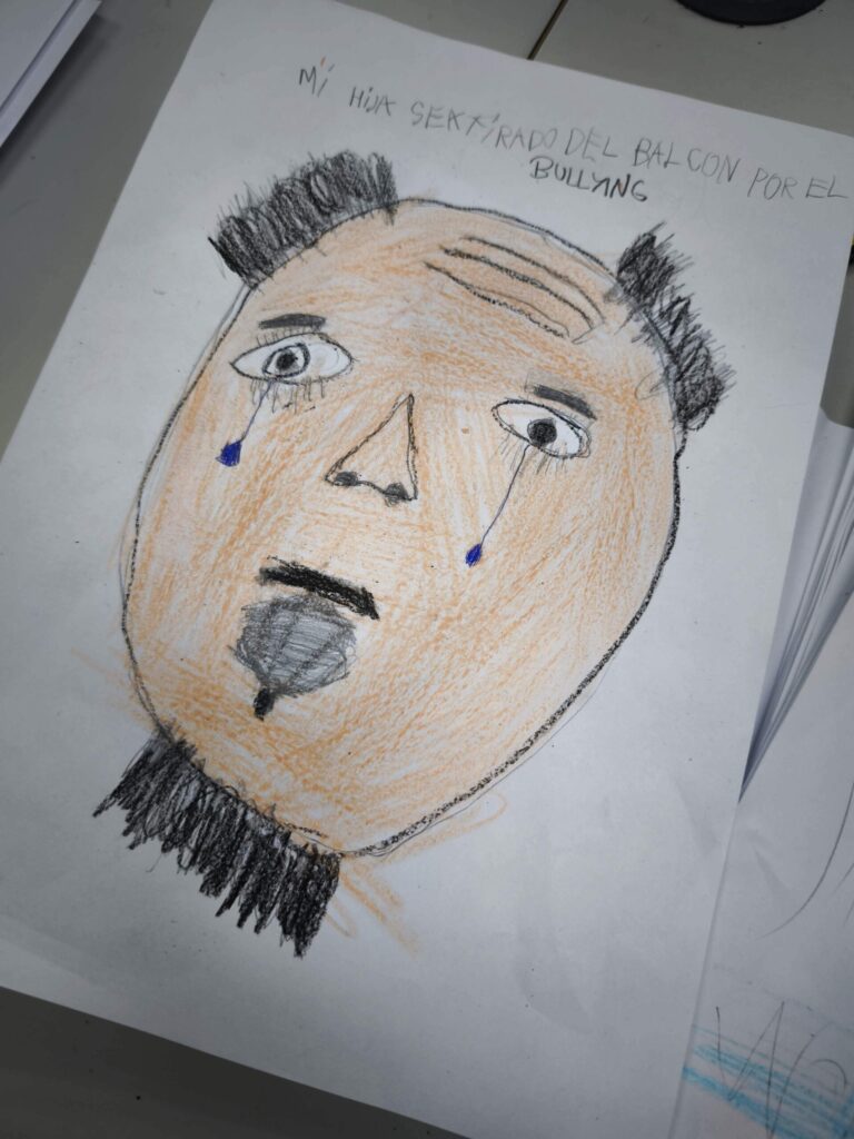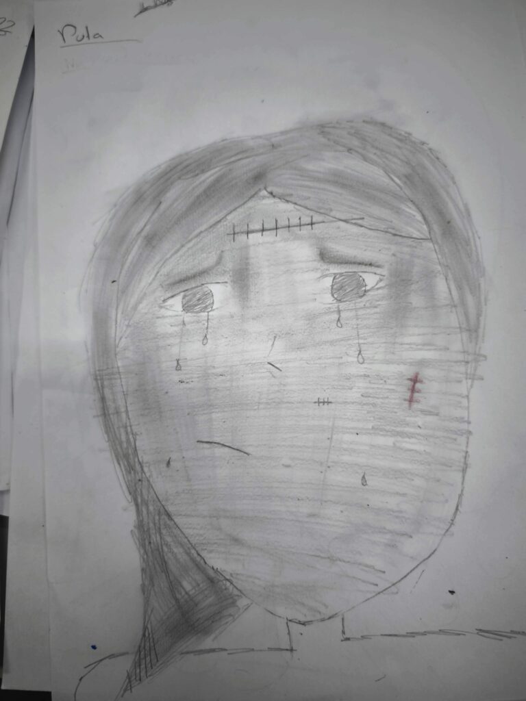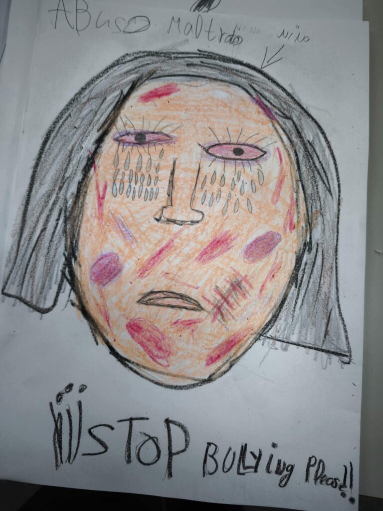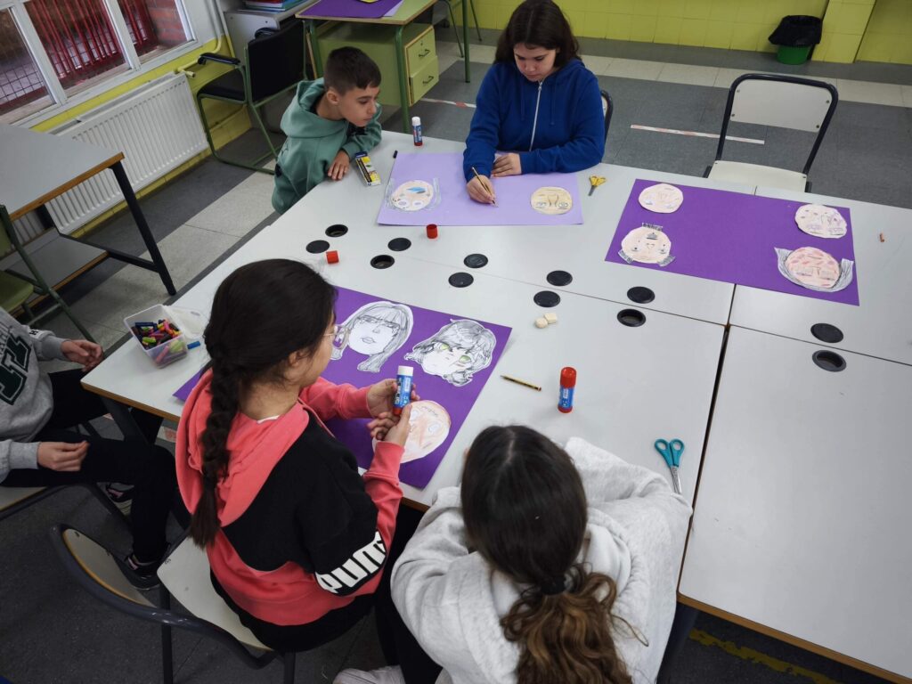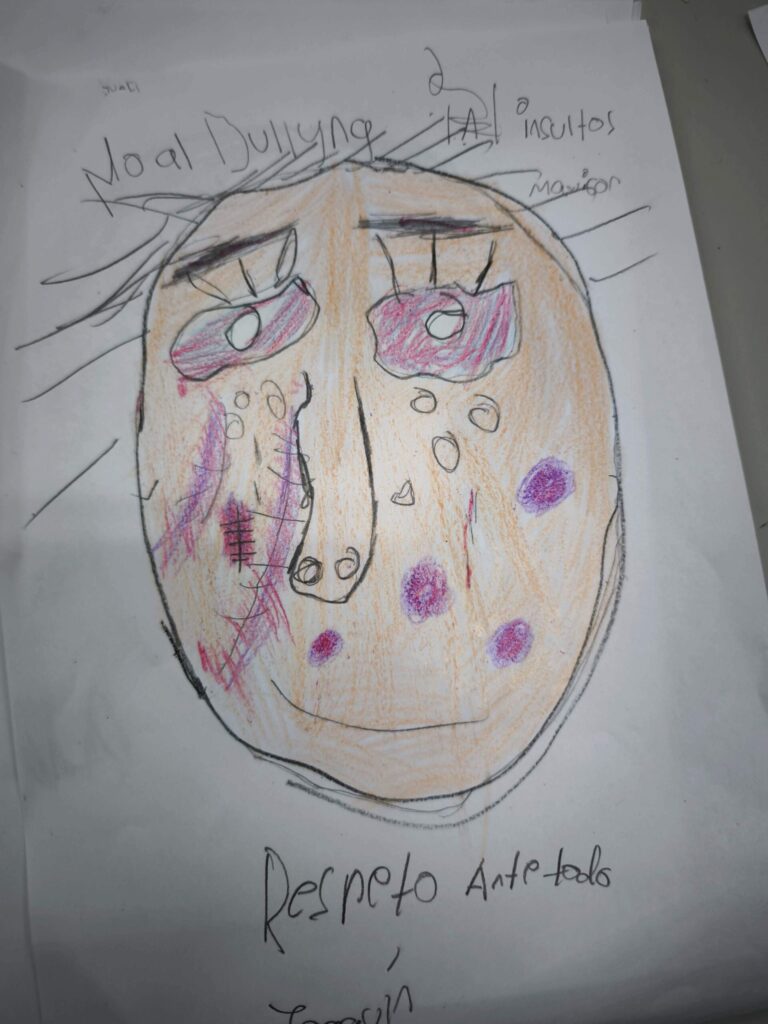 ¿Qué puede expresar una cara cuando no utilizamos palabras? A partir de ahí, los niños y niñas comenzaron a dibujar siluetas que fueron completando con colores, trazos y detalles que evocan emociones y vivencias. En las imágenes se observa cómo cada uno y cada una se concentró en construir un rostro marcado por señales simbólicas como cicatrices o lágrimas, que representaban así la realidad que sufren muchas mujeres en todo el mundo. El dibujo se convirtió en un espacio para pensar, sentir y exteriorizar aquello que a veces cuesta decir.