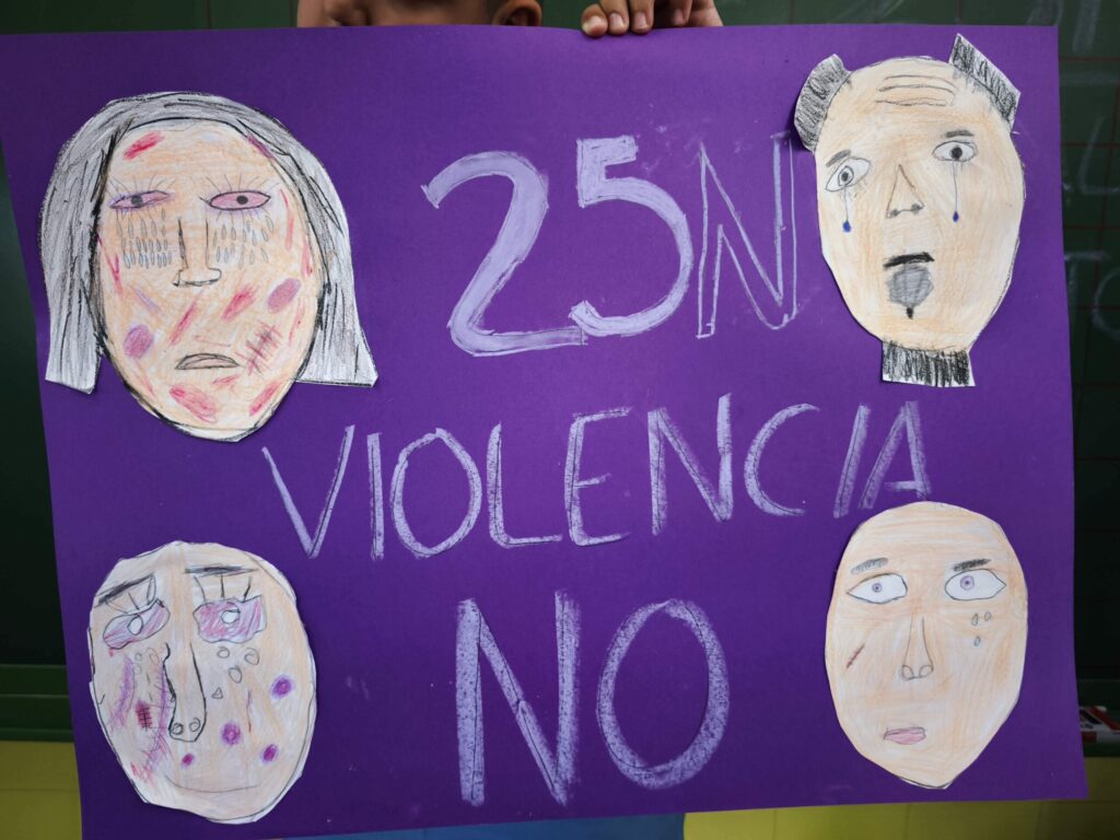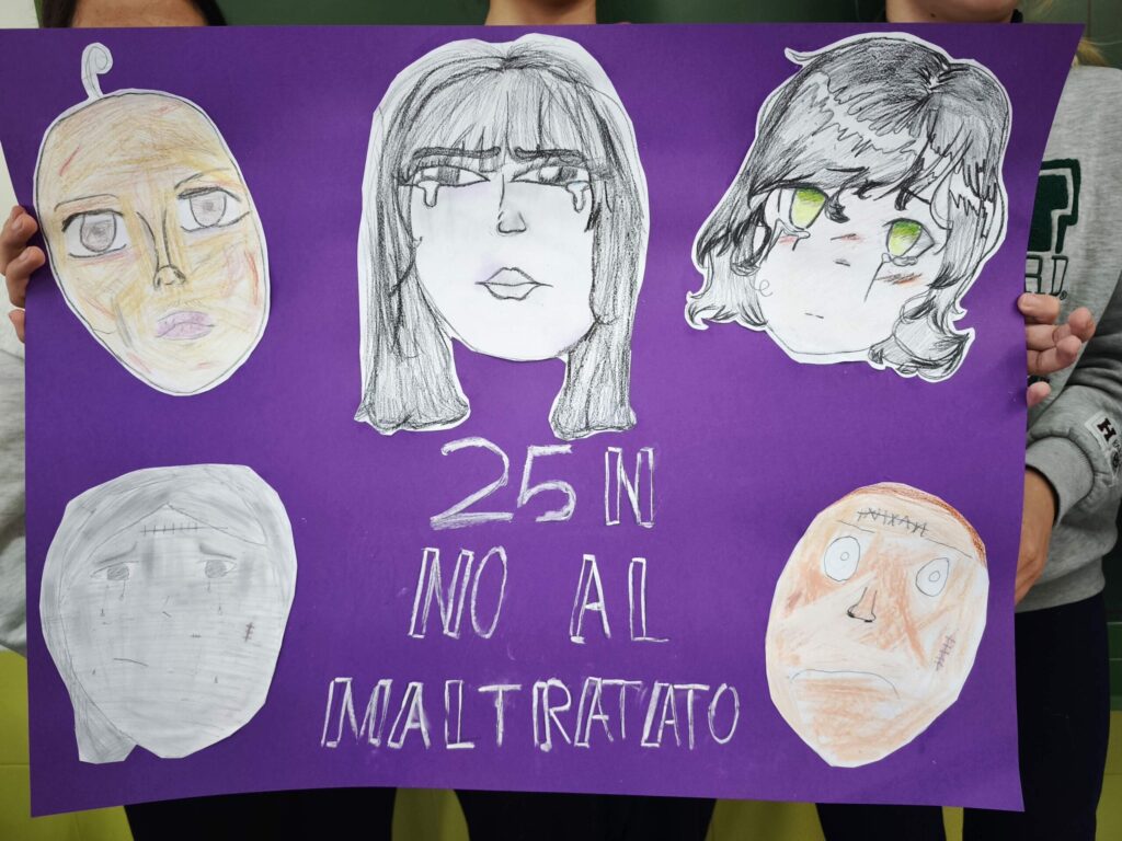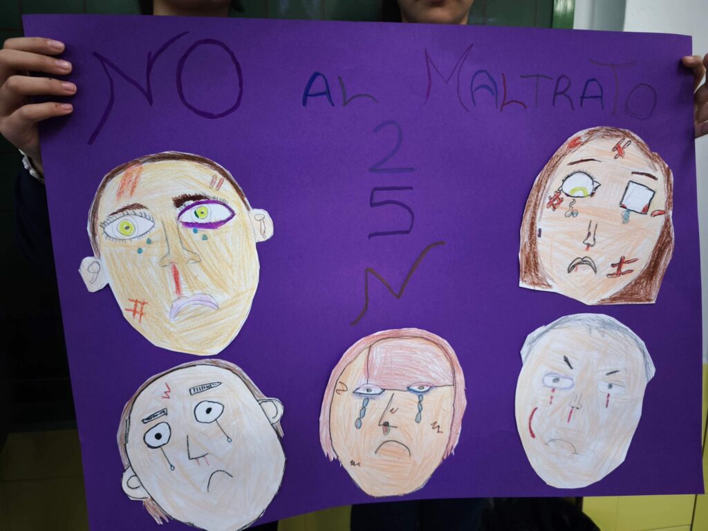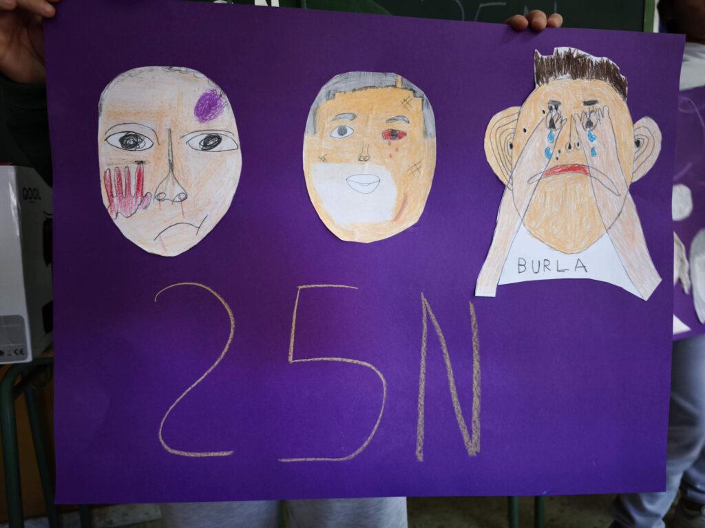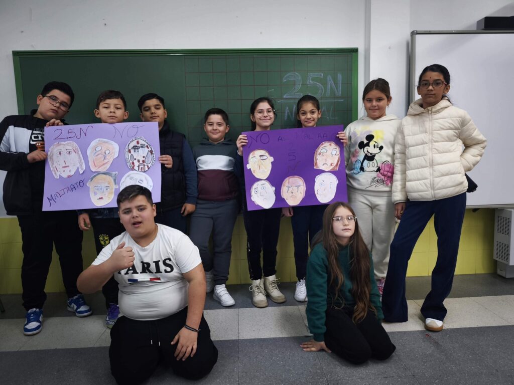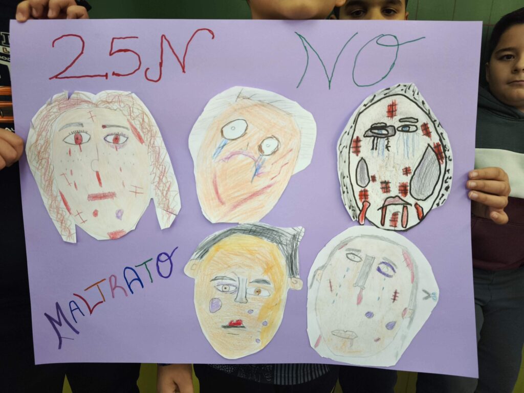 La actividad se cerró reuniendo todos los trabajos en carteles colectivos, donde se podía leer “25N” y mensajes como “Ni una más” o “No al maltrato”. Gamero Gil acompañó a cada niño y niña en el proceso, fomentando la reflexión desde el lenguaje artístico.