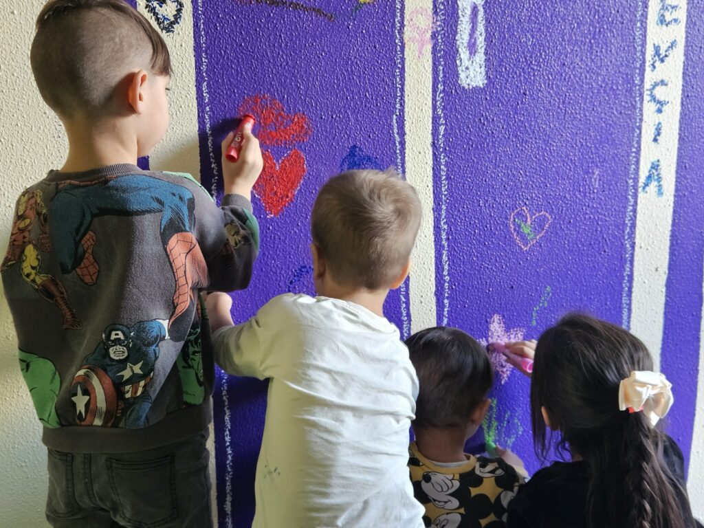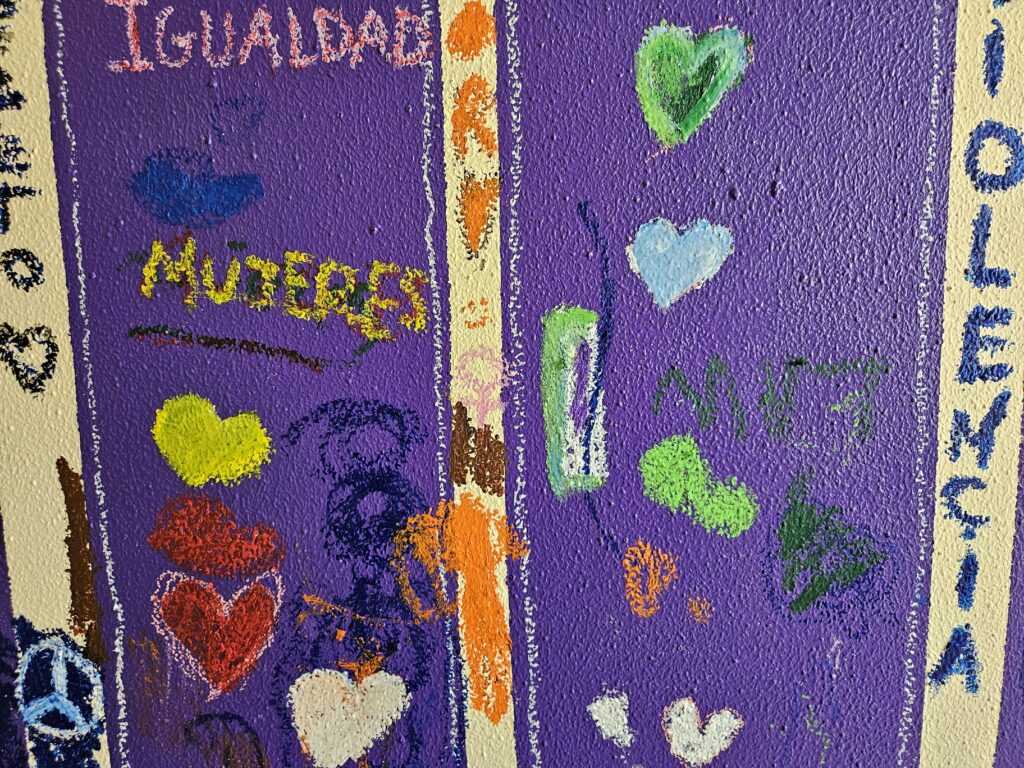 Como artista MUS-E del centro, he dinamizado una jornada que abrió una gran puerta violeta a la esperanza. Niños y niñas pintaron con entusiasmo ese símbolo en la pared, mientras los docentes acompañaban y apoyaban la acción con cariño y presencia.