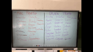 Tras esto, y haber mencionado también los tipos de violencia, no solo la física, nos hemos querido centrar en la psicológica, porque muchas veces pasa por alto. Hemos dividido la pantalla de clase en mal trato y buen trato, y hemos ido llenándola con palabras que asociaran a cada una. Tras esto, los alumnos escogían dos palabras, una de cada lado, y tenían que hacer sus propios pareados.