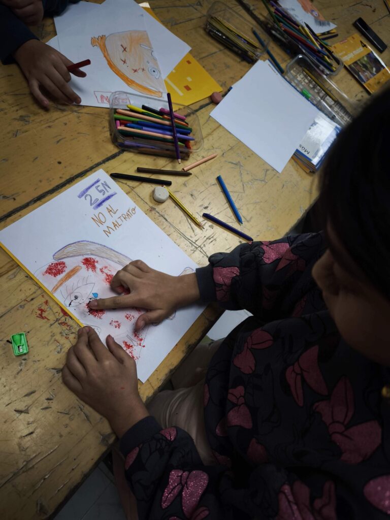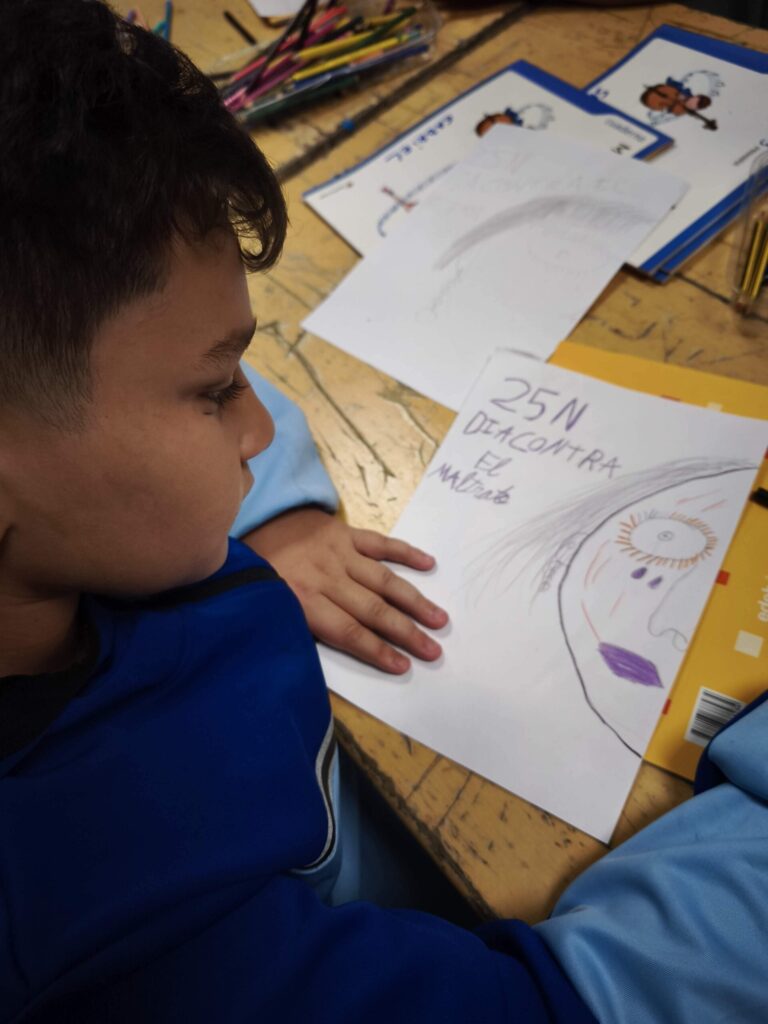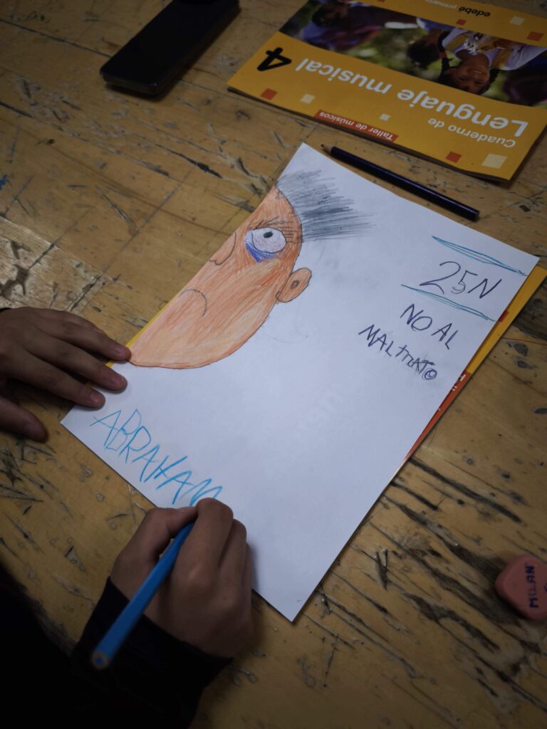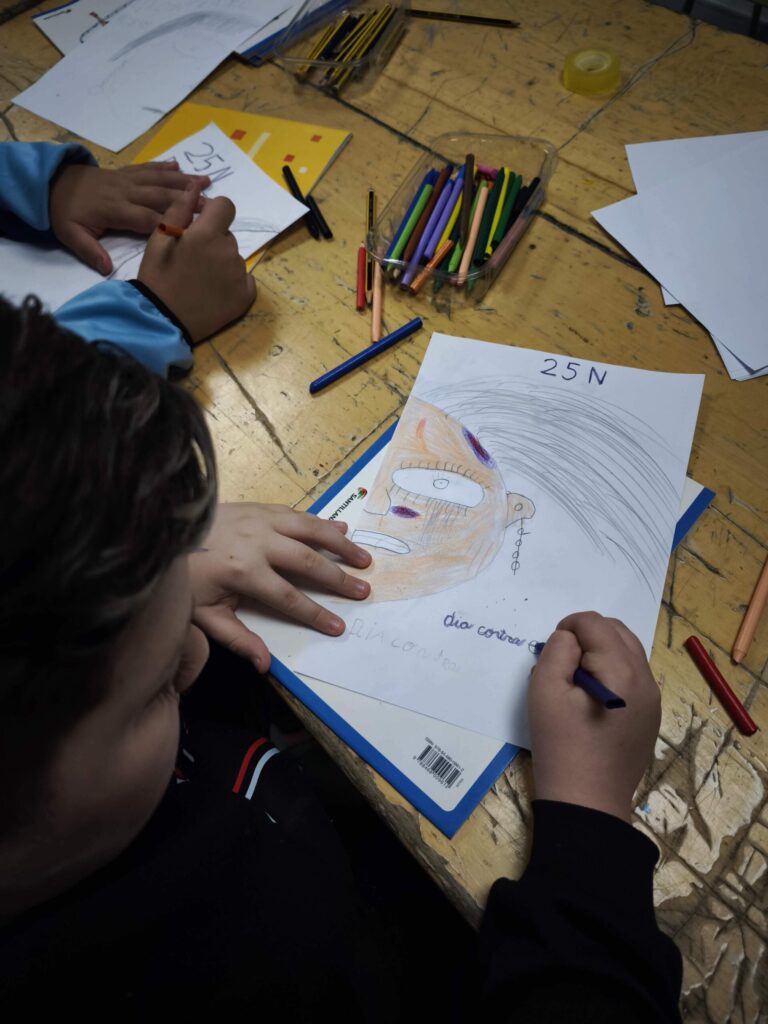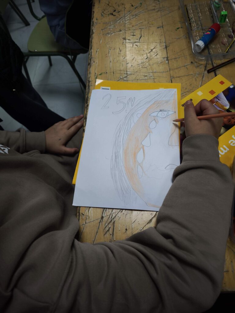 Luego, cada dibujo fue coloreado y detallado con lápices y ceras, dando lugar a composiciones muy distintas entre sí. Algunos retratos muestran líneas temblorosas; otros, manchas más densas o gestos que transmiten miedo. La disciplina de las artes plásticas permitió que niños y niñas experimentaran con el color, la forma y el trazo, relacionando estos elementos con emociones y conceptos que forman parte del 25N, como el respeto, la dignidad y la necesidad de detener cualquier forma de maltrato.