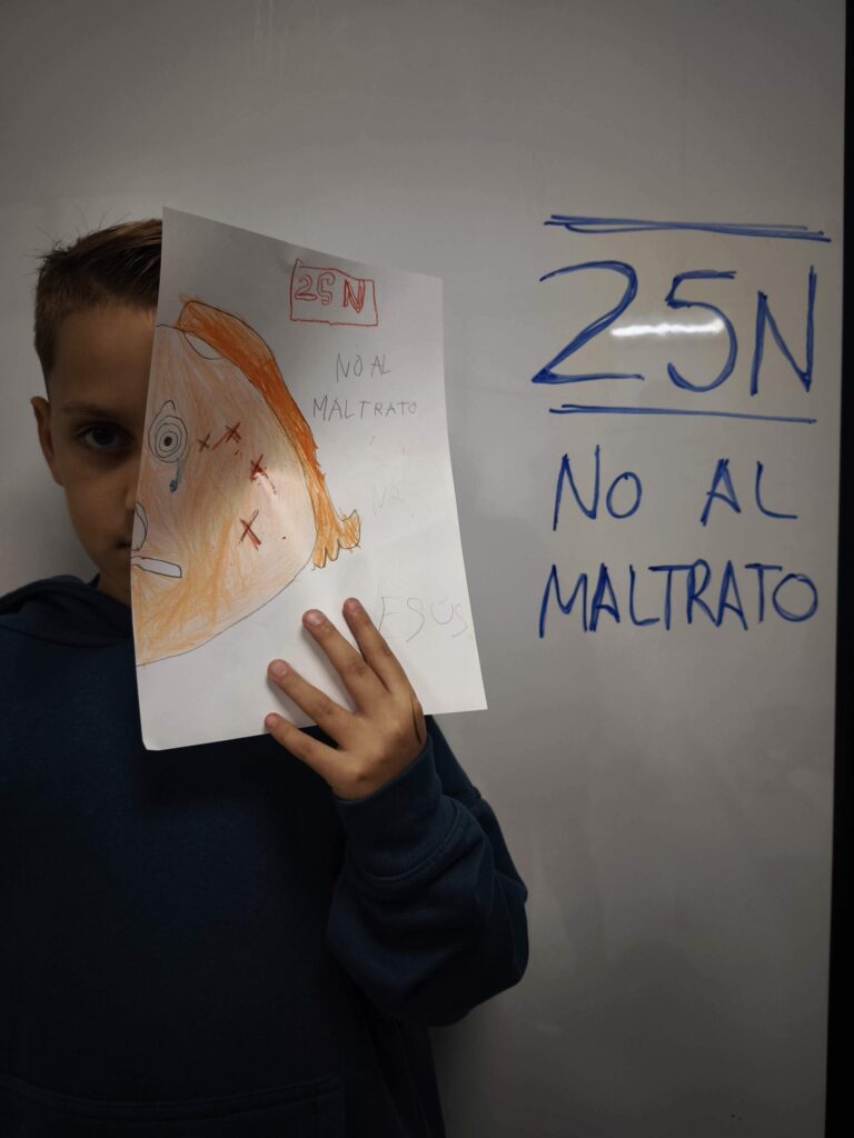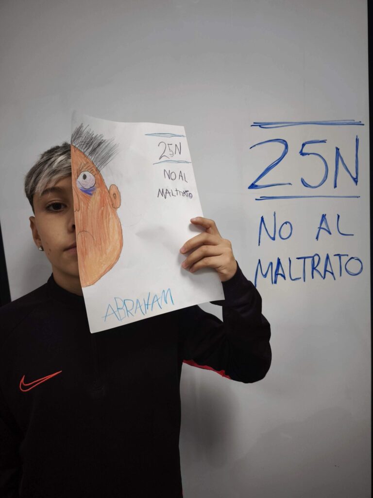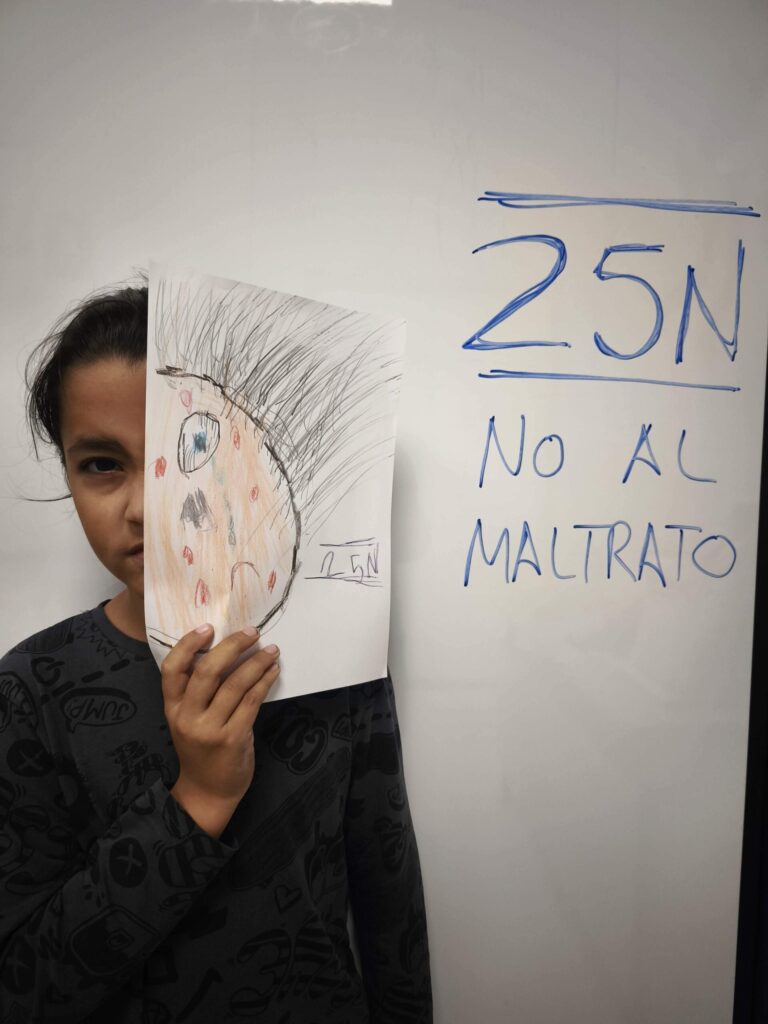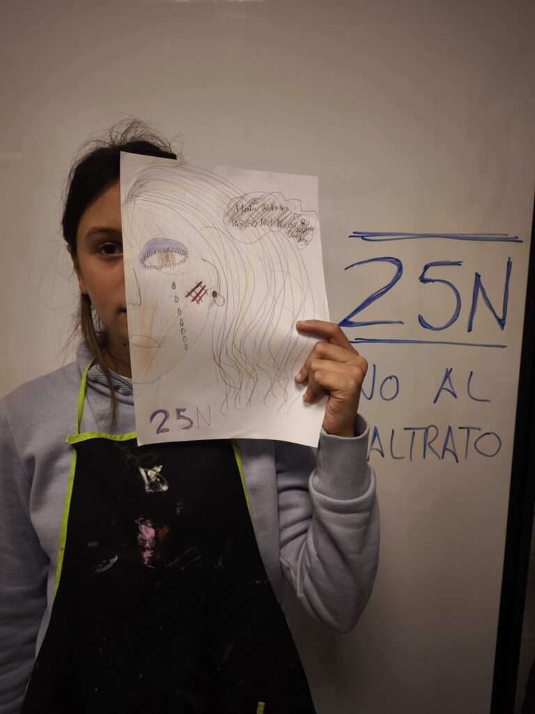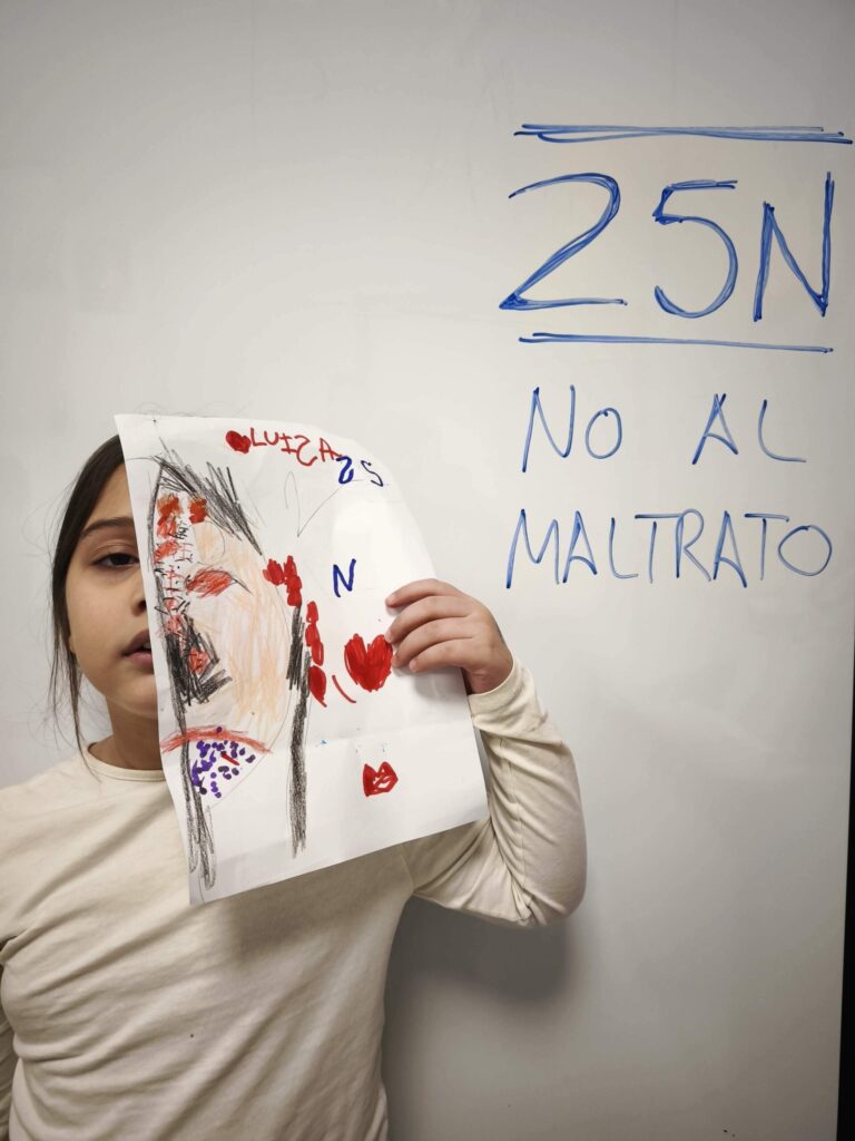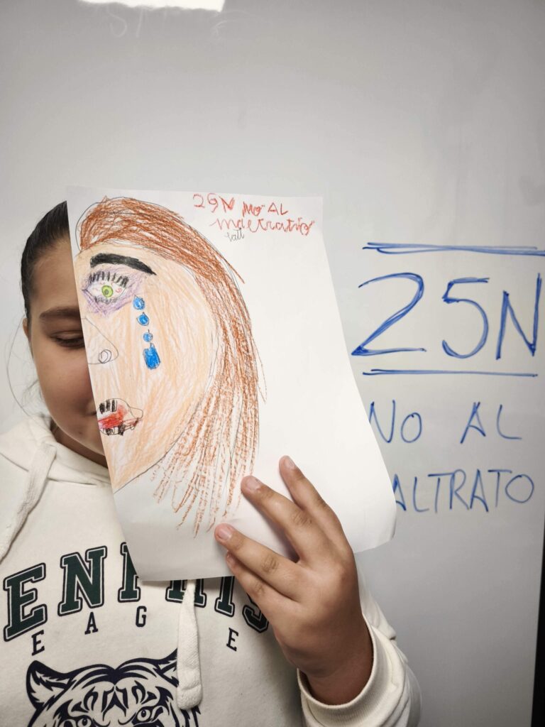 Luego, cada dibujo fue coloreado y detallado con lápices y ceras, dando lugar a composiciones muy distintas entre sí. Algunos retratos muestran líneas temblorosas; otros, manchas más densas o gestos que transmiten miedo. La disciplina de las artes plásticas permitió que niños y niñas experimentaran con el color, la forma y el trazo, relacionando estos elementos con emociones y conceptos que forman parte del 25N, como el respeto, la dignidad y la necesidad de detener cualquier forma de maltrato.