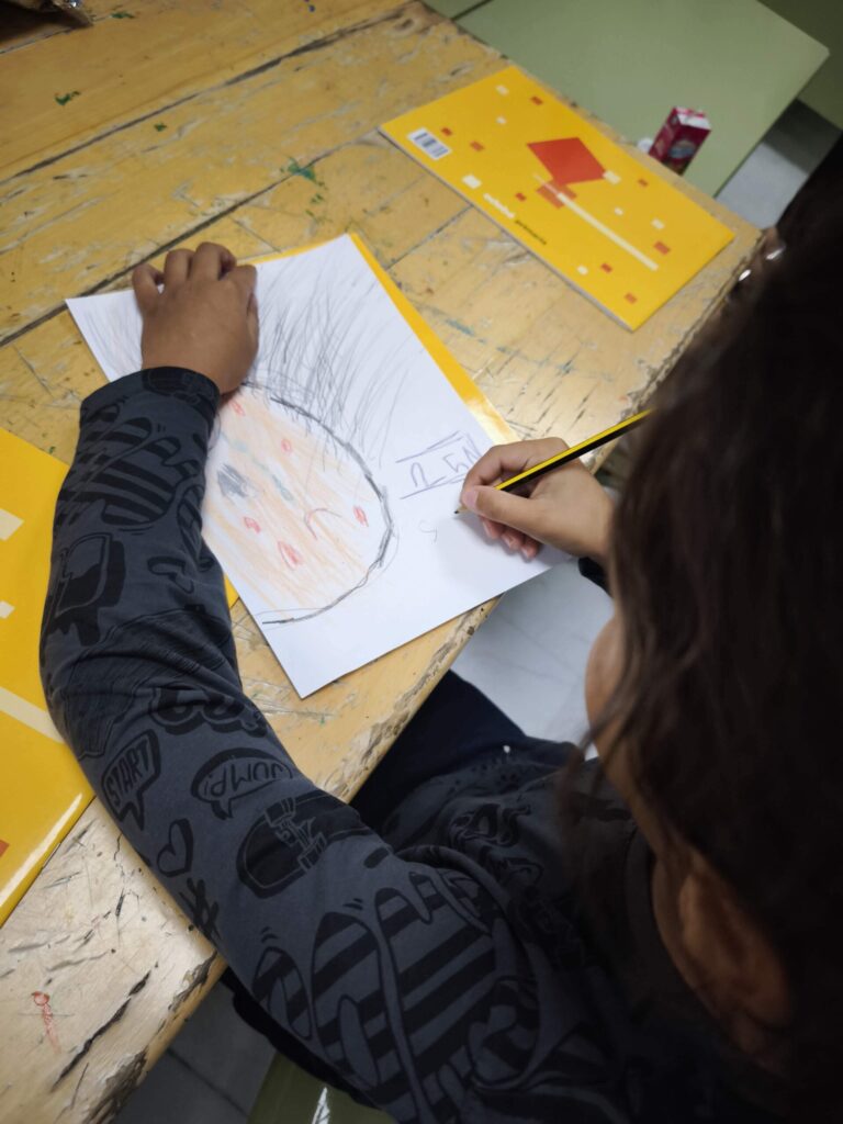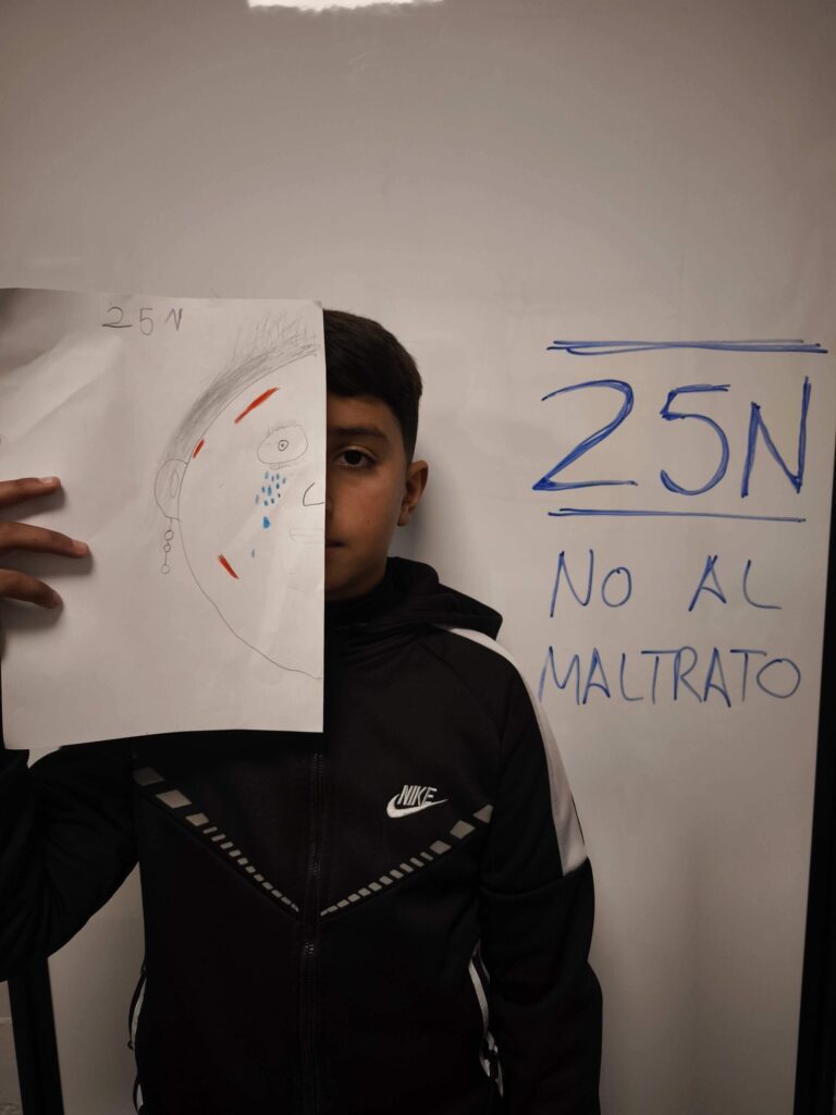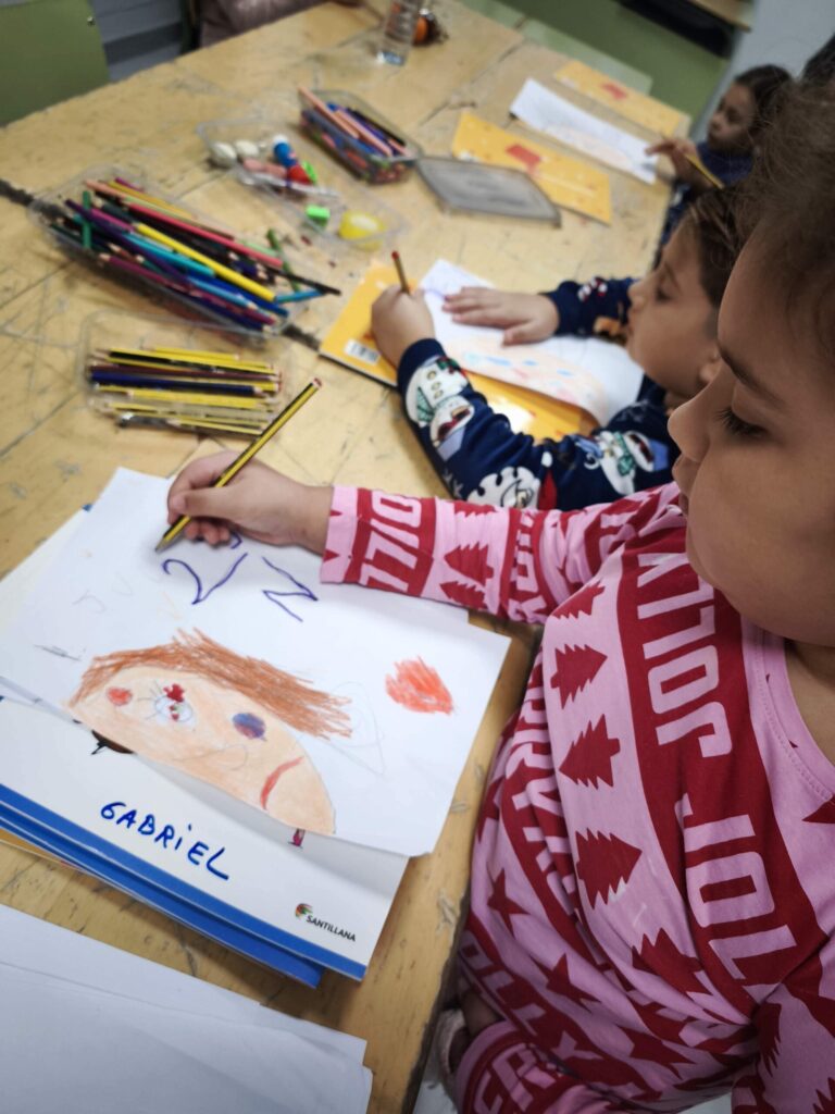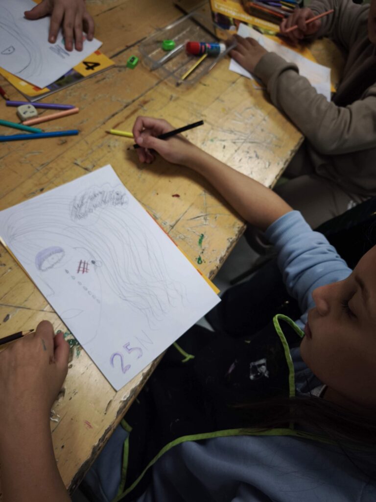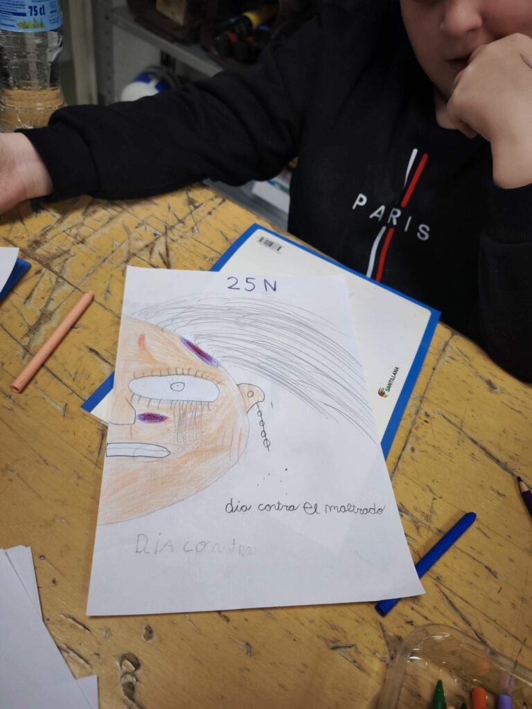 La actividad comenzó con una hoja en blanco y preguntándonos: ¿cómo podemos representar aquello que duele cuando lo vemos reflejado en una cara? Y fue lo que dió pie a que los niños y niñas dibujaran contornos y rasgos que fueron tomando forma mientras se añadían trazos, manchas de color, líneas que evocaban heridas y señales de sufrimiento. En las imágenes se aprecia cómo cada trabajo incorpora marcas simbólicas: golpes, arañazos, lágrimas, miradas tensas… para expresar aquello que muchas veces permanece oculto.