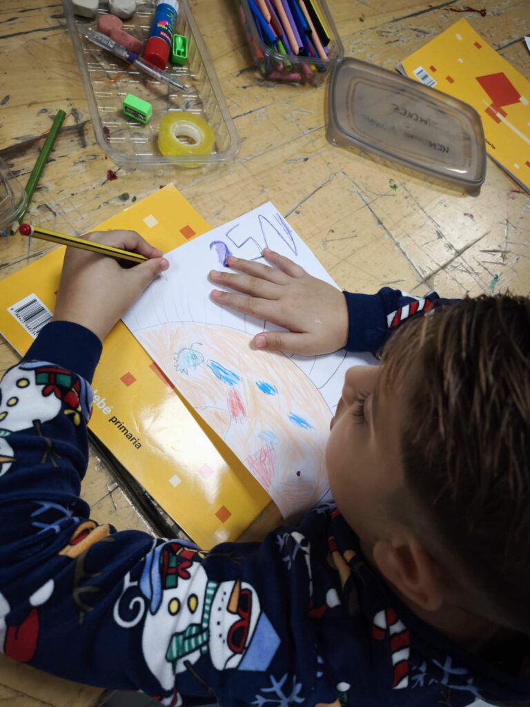 Además de trabajar individualmente, recortaron sus obras para emplearlas como máscaras. Al colocárselas frente al rostro, surgió un ejercicio de identificación y distancia al mismo tiempo: mirar a través de la expresión dibujada para comprender lo que implica ponerse en el lugar de otra persona. Este gesto reforzó la idea de que el arte permite comunicar y comprender realidades complejas sin necesidad de utilizar palabras.