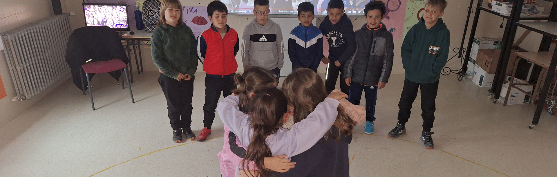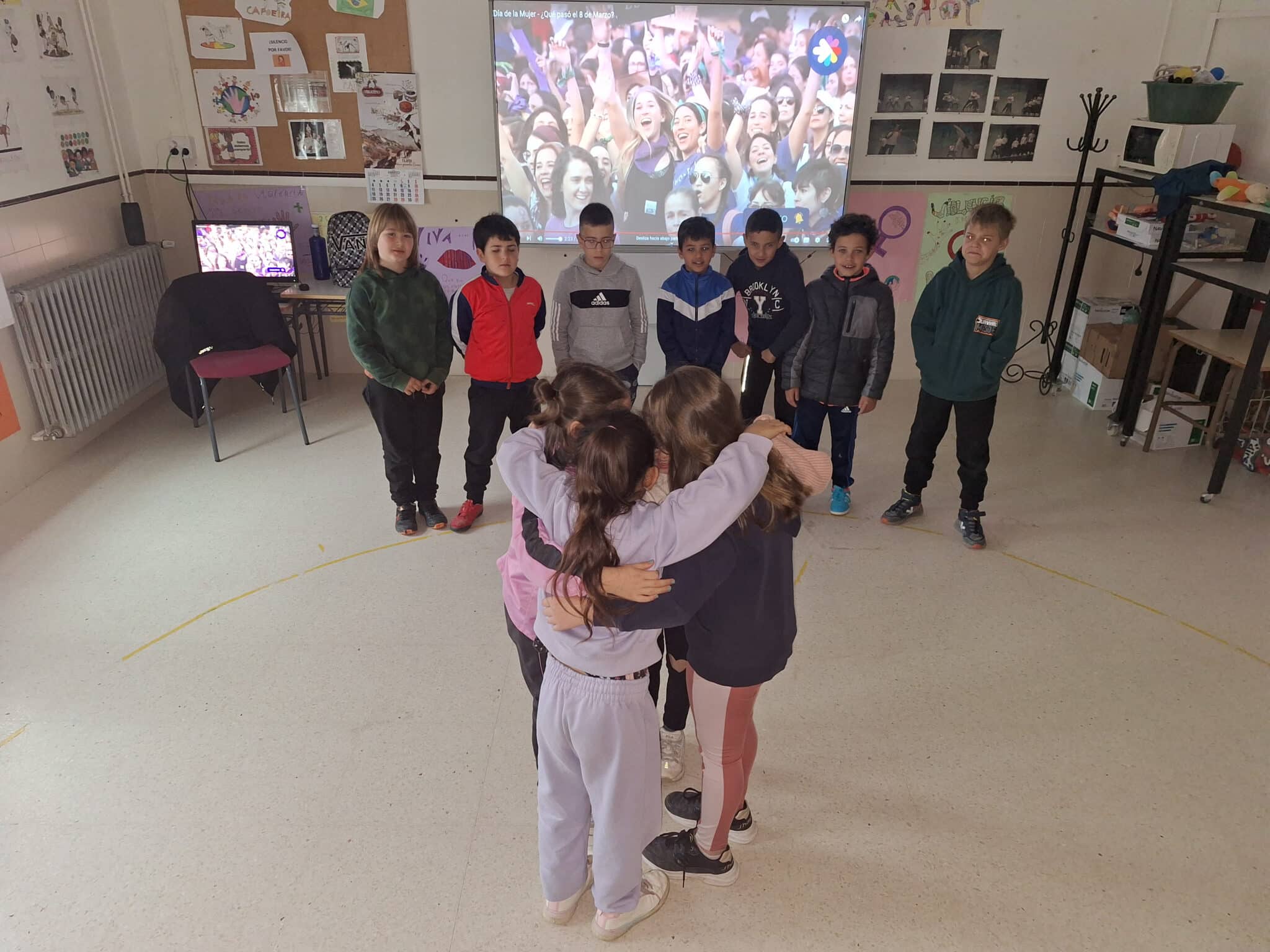 En esta ocasión, y acompañados por el artista MUS-E Denilson Santana, los estudiantes han tenido una jornada de lo más interesante donde juntos han puesto el foco en la lucha histórica de las mujeres por la igualdad de derechos y oportunidades. Durante una de las actividades, se ha dado un momento unión de las alumnas de la clase, quienes se han podido fundir en un abrazo a ojos del resto de compañeros y que deja un fuerte y claro mensaje: «aquí estamos, unidas. Unidas somos más fuertes. Y marcharemos por nuestros derechos, porque aún queda mucho por hacer».