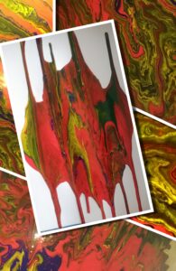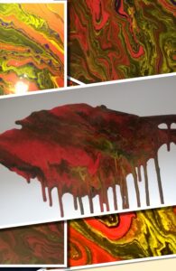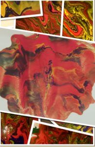“Seguimos con el cine como hilo conductor. Esta semana hemos visto un trozo de la considerada la primera película sonora de la Historia, el cantante de Jazz, posteriormente teníamos preparados infinidad de objetos que suenan por contacto, por electricidad, por rozamiento, etc, batidora, teléfonos, timbres, cucharillas, cañas de bambú, plásticos, maderas, agua, canicas, almendras, martillos, vidrio, etc, etc. Jugamos con el sonido de dichos objetos y la escucha de los niños y niñas, intentado descubrir que era lo que sonaba, y mostrándoles cual era el objeto sonoro, luego, todos por el espacio tomamos conciencia del sonido que tienen los objetos experimentando con, las sillas, mesas, persianas, al chocar una cosa con otra, nuestra respiración, los pasos andando, los pasos corriendo, etc, etc. Trabajando la escucha y el aprendizaje por experimentación, además del silencio, el orden a la hora de hablar, la conciencia sonora, etc, etc Para terminar, creamos unos dibujos entre todos al ritmo de la música clásica que pusimos, usamos tintes para pintura plástica, que tienen una densidad y un brillo especial, cada niño o niña, iba entrando y echando un chorro de pintura sobre el lienzo, uno detrás de otro y uno encima del otro, para finalizar, fuimos pasando el lienzo, que iba dentro de una caja, de unos a otros mientras bailábamos de manera que la pintura se iba moviendo y creando las formas que veis en las fotos, obras creadas por niños y niñas de 3, 4 y 5 años. Trabajando la creación colectiva, la cooperación, el ritmo, la creatividad, etc”