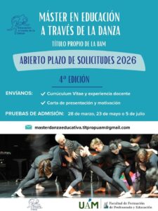 Ya están abiertas las solicitudes de plaza para la 4ª edición del MÁSTER DE FORMACIÓN PERMANENTE EN “EDUCACIÓN A TRAVÉS DE LA DANZA», que se desarrollará entre septiembre del 2026 y febrero del 2028.