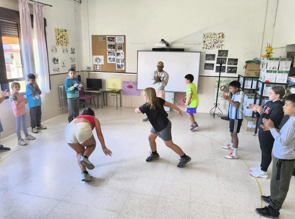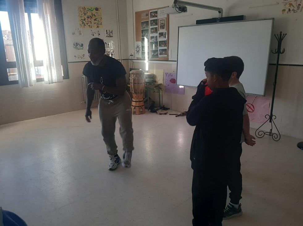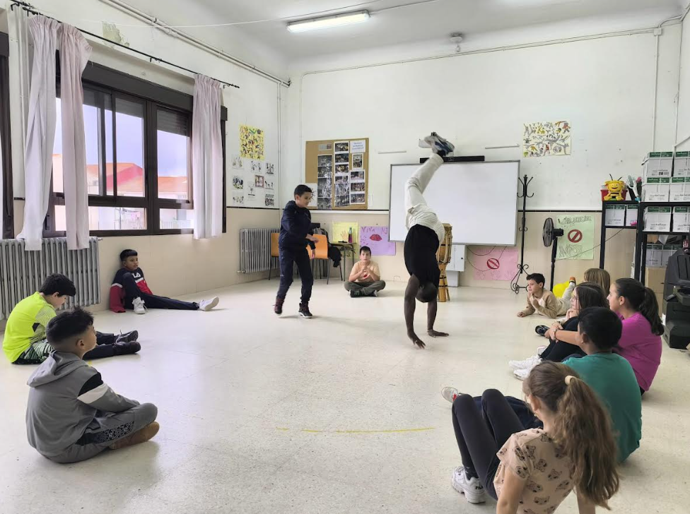 Por su parte, la intervención de Ermis permitió acercar la capoeira de forma adaptada y accesible. La combinación de ritmo, defensa, danza y acrobacia introdujo al grupo en una práctica donde la música y el movimiento se encuentran constantemente. La ginga, los desplazamientos circulares y algunos movimientos básicos sirvieron para trabajar coordinación, atención, escucha y respeto hacia el compañero y la compañera, elementos fundamentales en la base de esta disciplina brasileña.