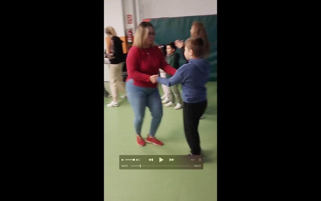 Con las familias hemos presentado la coreografía preparada en cada clase del himno de los 25 años del MUS-E en España. También hemos bailado juntos algunos bailes sencillos con mucha interacción para que se divirtiesen y tuviesen un momento de expresión a través de la música. Ha sido muy bonito poder compartir estas buenas prácticas con las familias, la mayoría migrantes. Este mes también hemos trabajado un repertorio de danzas tradicionales de diferentes lugares del mundo intentando pasar por algunos de los países de donde vienen los chiquillos. Por ejemplo de Perú, Rusia, Ucrania, Colombia, entre otros.