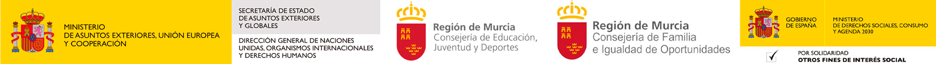 El programa Cortos para no cortar los Derechos Humanos es posible gracias a la colaboración del Ministerio de Asuntos Exteriores, Unión Europea y Cooperación, a la Consejería de Educación, Juventud y Deportes de la Región de Murcia, a la Consejería de Familia e Igualdad de Oportunidades de Región de Murcia y el Ministerio de Derechos Sociales, Consumo y Agenda 2030 a través de su convocatoria del 0,7%.