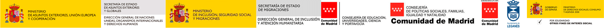 Esto ha sido posible gracias al Ministerio de Asuntos Exteriores, Unión Europea y Cooperación, al Ministerio de Igualdad, al Ministerio de Inclusión, Seguridad Social y Migraciones, a la Consejería de Educación, Universidades, Ciencia y Portavocía de la Comunidad de Madrid, la Consejería de Políticas Sociales, Familias, Igualdad y Natalidad de la Comunidad de Madrid, al Ayuntamiento de Leganés. y el Ministerio de Derechos Sociales, Consumo y Agenda 2030 a través de su convocatoria del 0,7%.