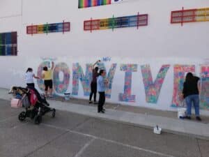 Todo el centro, familias incluidas, formaron parte de esta idea. Se pintó de forma libre, con la idea de crear algo con lo que ya existe. No consiste en destruir lo anterior, por norma, sino en transformarlo en algo que nos guste más. Así fueron pasando los diferentes grupos del centro durante dos días, pintando y creando sobre lo que sus compañeros habían realizado anteriormente. Finalmente las familias nos ayudaron a crear una última acción sobre los dibujos de los chicos y de las chicas. Y esa acción fue crear la palabra ‘Convivencia’.
