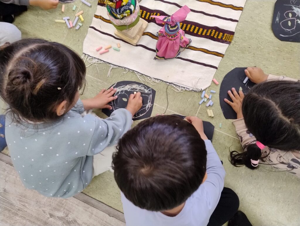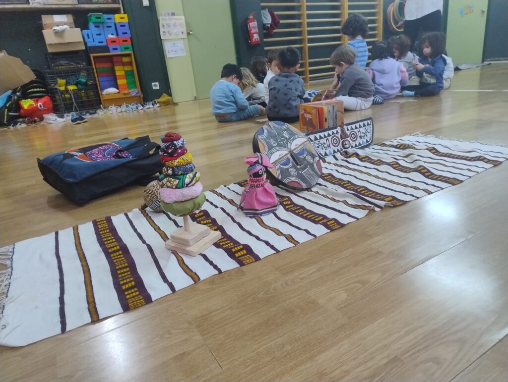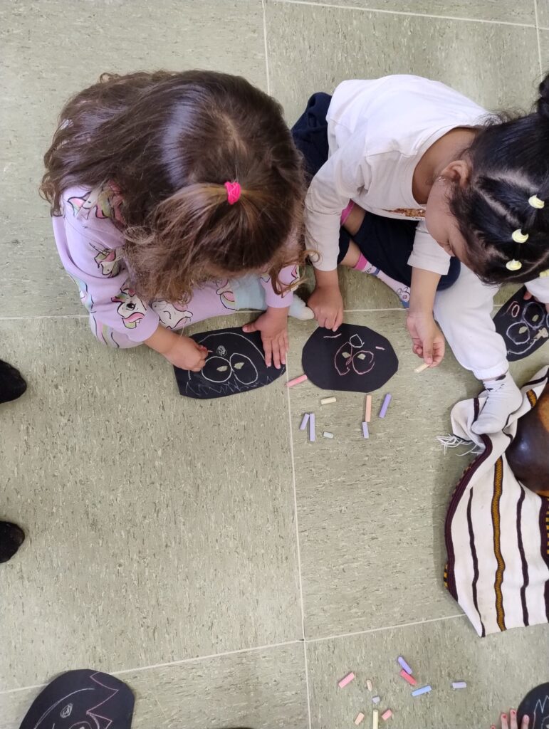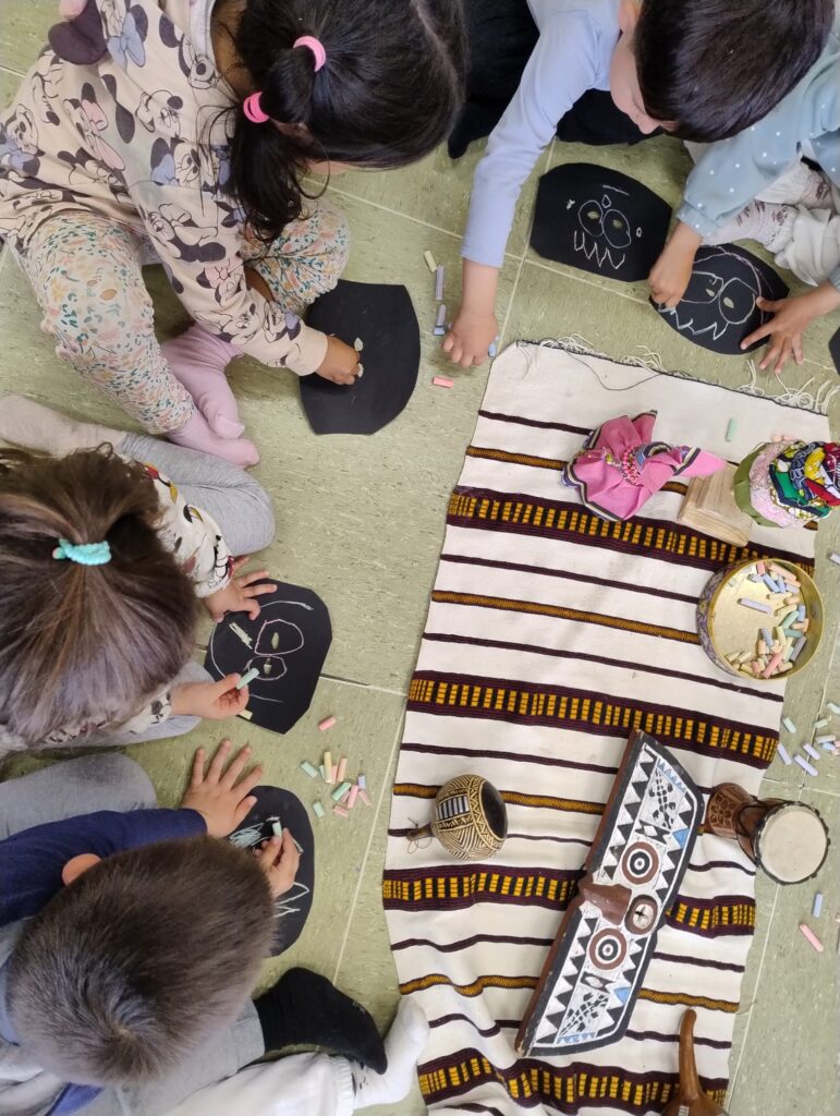 Se mostraban los objetos (¡eran muy responsables en el cuidado, muy curiosos en mirarlos, tocarlos, olerlos… y pasándolos a sus compis!). Se contaba el cuento y se realizaba una actividad de movimiento corporal expresivo para finalizar con una actividad plástica. Todo muy hilado y con el sentido de explorar diferentes lenguajes creativos. (Por ejemplo: la leyenda africana de cómo se creó el cielo; luego del cuento jugábamos con trocitos de nubes, poníamos música africana, y luego dibujábamos un gran cielo entre todas. Otro ejemplo: el cuento de la tortuga; hacíamos una secuencia de yoga con la postura de la tortuga, respirábamos, y luego con plastilina hacíamos tortugas, etc.).