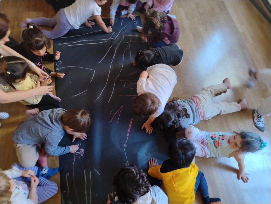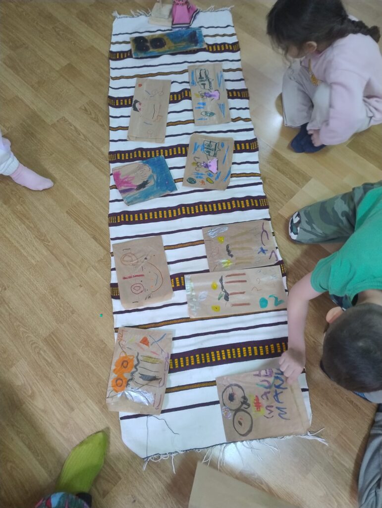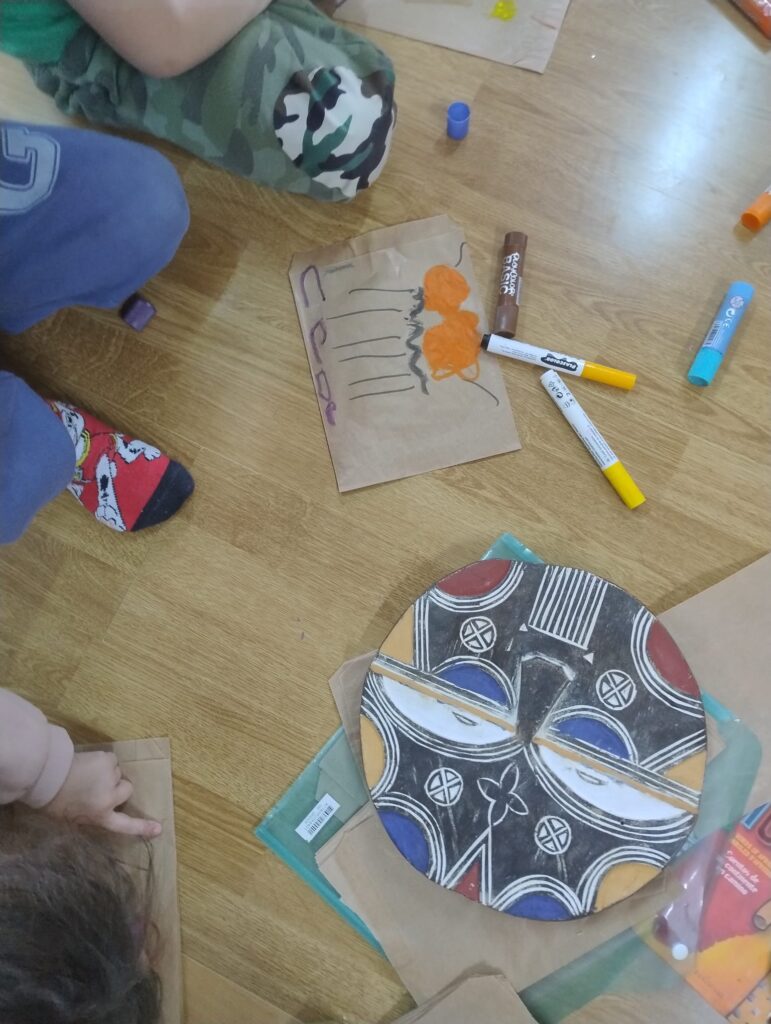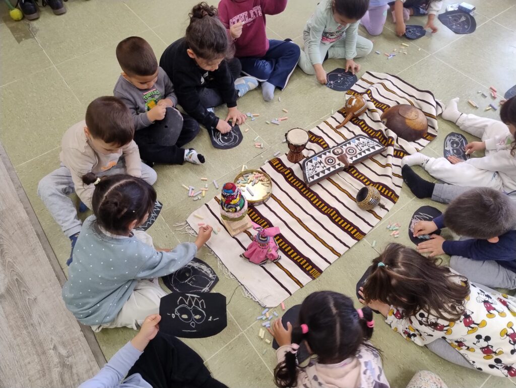 Se mostraban los objetos (¡eran muy responsables en el cuidado, muy curiosos en mirarlos, tocarlos, olerlos… y pasándolos a sus compis!). Se contaba el cuento y se realizaba una actividad de movimiento corporal expresivo para finalizar con una actividad plástica. Todo muy hilado y con el sentido de explorar diferentes lenguajes creativos. (Por ejemplo: la leyenda africana de cómo se creó el cielo; luego del cuento jugábamos con trocitos de nubes, poníamos música africana, y luego dibujábamos un gran cielo entre todas. Otro ejemplo: el cuento de la tortuga; hacíamos una secuencia de yoga con la postura de la tortuga, respirábamos, y luego con plastilina hacíamos tortugas, etc.).