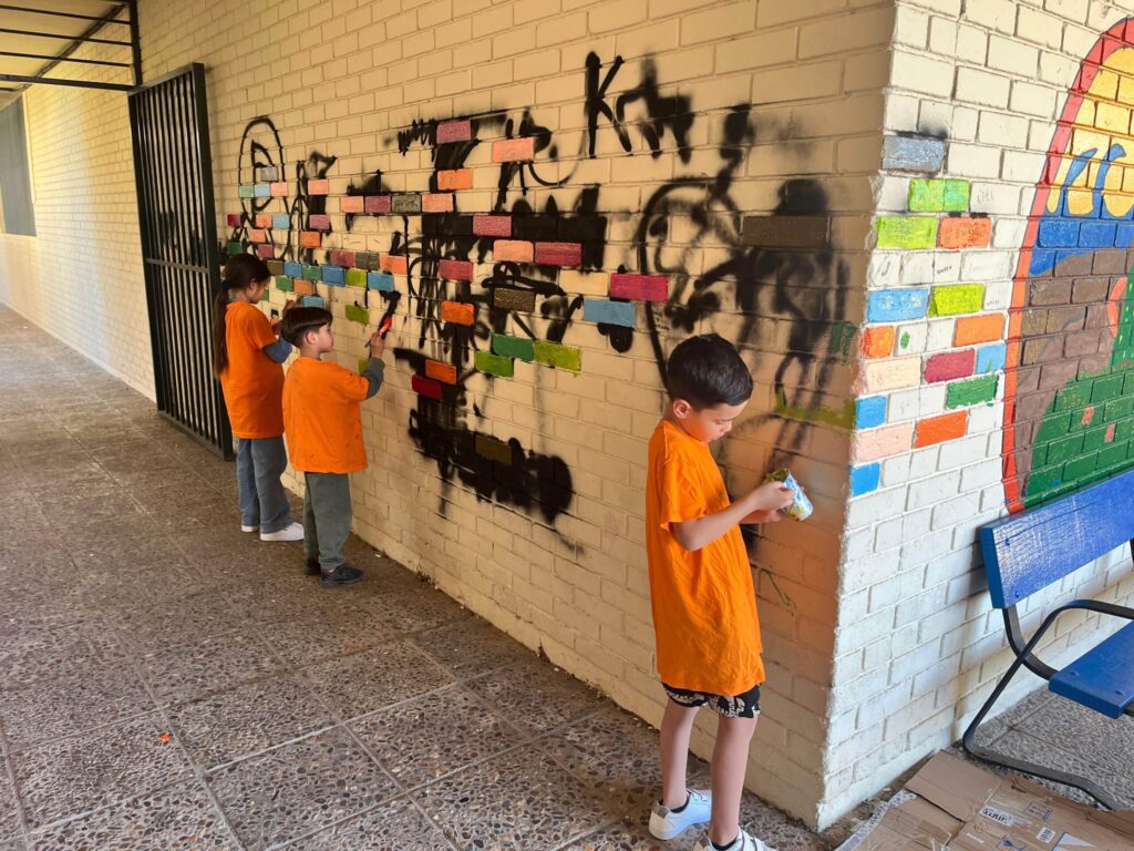 El hecho de que estas intervenciones se sitúen en lugares concretos del centro, como la zona de siembra vegetal o el escenario del salón de actos, refuerza además el carácter compartido del trabajo. Los murales pasan a formar parte del entorno cotidiano de niños y niñas, docentes y familias, y convierten el espacio escolar en un lugar donde el arte dialoga con la vida del centro.