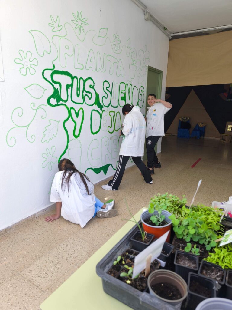 La propuesta ha tenido varias líneas de desarrollo. Por un lado, se ha trabajado en el retoque y completado de murales con motivo del Día del Centro. Por otro, han comenzado nuevas creaciones para la zona de siembra vegetal y para el escenario del salón de actos. De este modo, el arte no se ha limitado a una actividad puntual, sino que se ha incorporado a la vida del centro como una práctica que transforma los espacios y acompaña procesos que se van construyendo con continuidad.