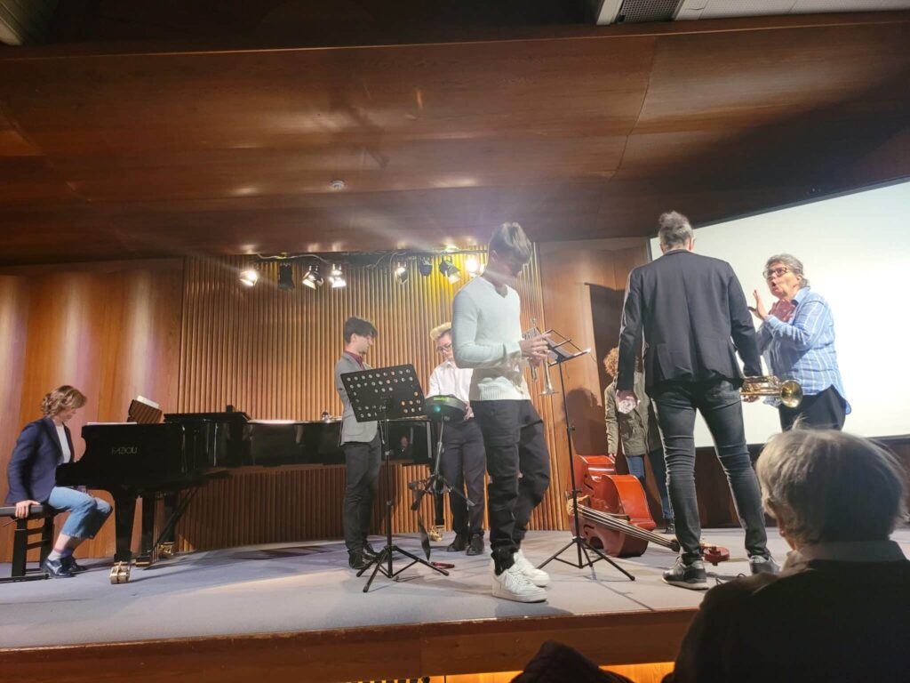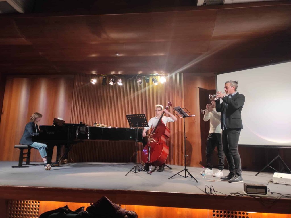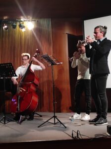 El espectáculo tuvo el privilegio de tener su colofón con la actuación de los alumnos (acompañados de sus profesores) del Instituto Musical ‘Angeloni’: un dúo muy animado de violín y piano y un cuarteto de trompetas, contrabajo y piano – alumnos de los talleres ‘Musica Insieme’ interpretaron espléndidamente piezas de Mozart que acompañaron y enriquecieron la muy interesante interpretación escénica del contraste reelaborado por la clase durante las actividades del Laboratorio artístico EMOCIONARTE. El tema principal del espectáculo, sin embargo, es la trama de la inclusión, aún más compleja en los procesos de inclusión, precisamente en situaciones donde la alienación se vuelve más dolorosa.