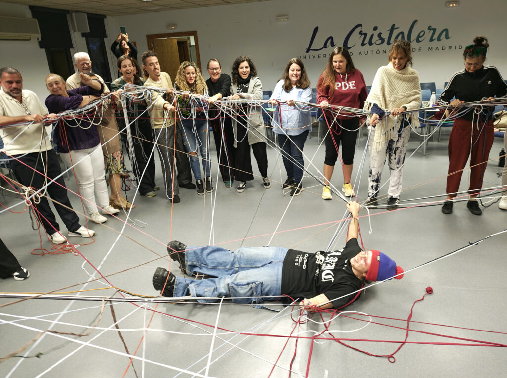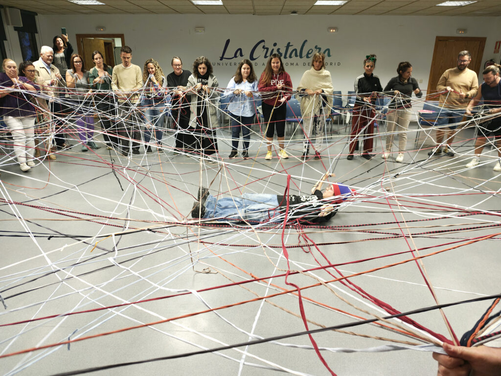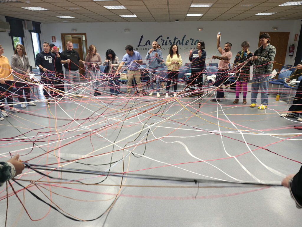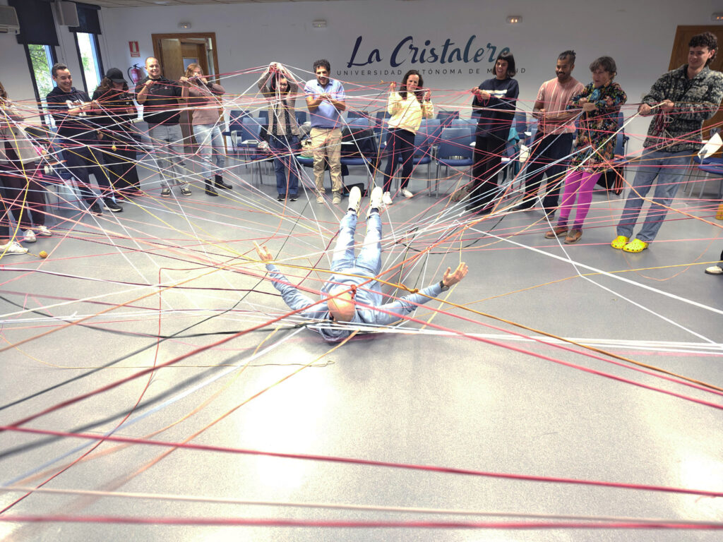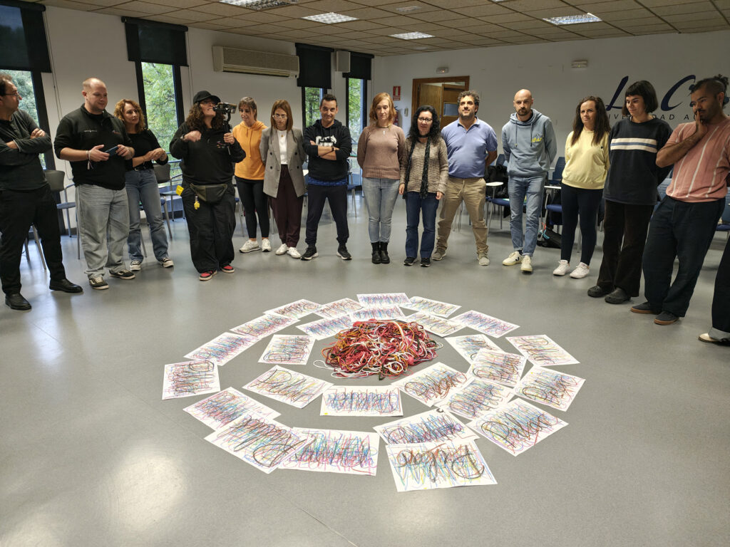El Encuentro Internacional IntegrArte – Metodología MUS-E contó con un taller creado por Javier Abad Molina y Ángeles Ruiz de Velasco Gálvez, diseñado y ejecutado para el desarrollo de quienes asistieron: “El lugar del símbolo”, una propuesta de juego performativo concebida para hacer visible la comunidad a través de la trama. La dinámica —planteada como una “firma colectiva” hilada con el “hilo de la vida”— propuso un gesto sencillo y compartido que teje identidades y pertenencias sin centrarse en nombres propios. Por cuestiones de permisos, no se identifican personas, pero la secuencia queda representada en imágenes del proceso, que dan rostro e identidad al momento vivido.