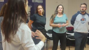 El taller de Eva Racionero planteó juego dramático con foco en cuerpo, voz y presencia. Se trabajaron dinámicas de confianza, escucha y status, y se construyeron microescenas a partir de consignas claras. La reflexión final recogió pautas para integrar el teatro en tareas de mediación, comunicación y proyectos interdisciplinares.