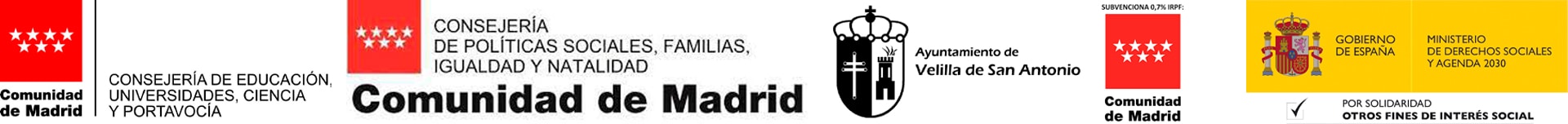 Esto ha sido posible gracias a la Consejería de Educación, Universidades, Ciencia y Portavocía de la Comunidad de Madrid, a la Consejería de Políticas Sociales, Familias, Igualdad y Natalidad de la Comunidad de Madrid, a la Subvención del 0.7% de la Comunidad de Madrid y a la participación del Ministerio de Derechos Sociales y Agenda 2030 a través de su convocatoria del 0,7%.