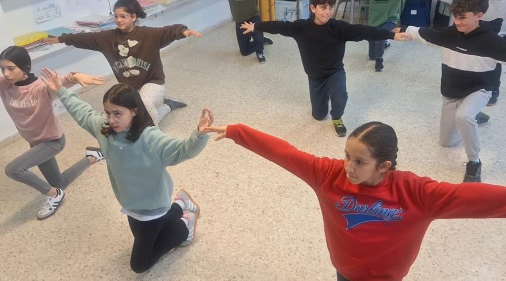 Hay que destacar además que uno de los momentos de trabajo se centró en el uso de las manos como guía para la mejora de movimientos sobre el escenario. Esta práctica fomenta la observación, la escucha y la colaboración entre compañeras y compañeros, en un proceso donde el arte se convierte en medio para afinar la conciencia corporal. Por otro lado, por carnaval, se propuso una actividad de creación grupal. A través del cuerpo, niñas y niños formaron una imagen conjunta, poniendo en juego la capacidad de imaginar y construir en grupo. El trabajo artístico permitió generar una composición sin necesidad de objetos adicionales, reforzando el valor del cuerpo como herramienta creativa.
