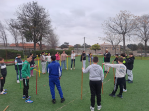 Durante una de las sesiones se llevó a cabo una dinámica con picas que puso el foco en el trabajo colectivo. A través del movimiento y la coordinación, niñas y niños, mujeres y hombres, desarrollaron acciones conjuntas que requerían atención, respeto de turnos y cooperación. Actividades como esta refuerzan la importancia de la escucha, la presencia y la construcción conjunta desde el lenguaje del cuerpo.