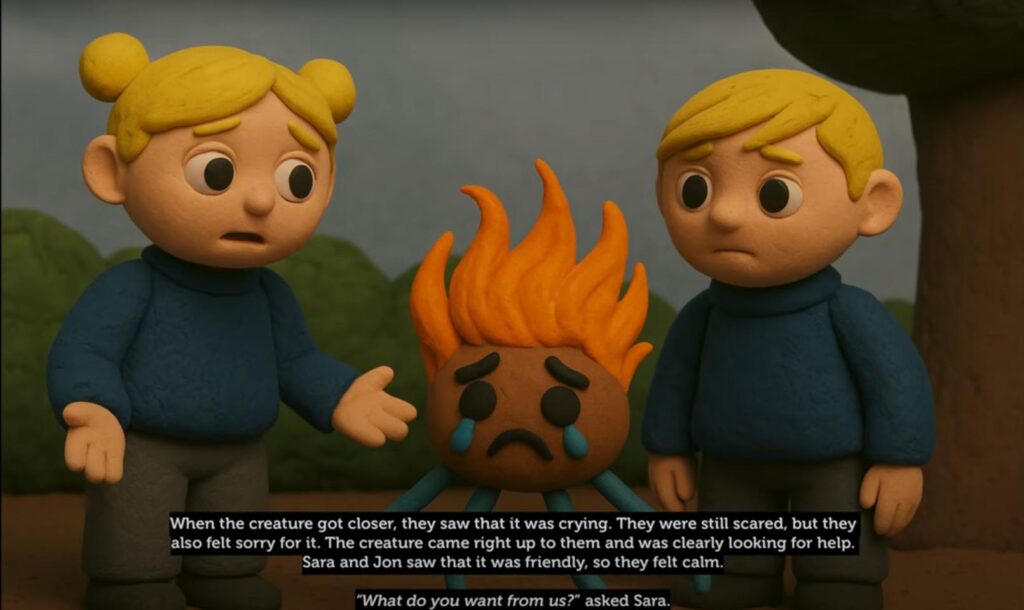 A Jón y Sara les pareció aterradora, así que no se atrevieron a avanzar. Pero cuando la criatura se acercó, vieron que estaba llorando. Aunque seguían asustados, también sintieron compasión. La criatura se les acercó claramente en busca de ayuda. Al ver que era amistosa, se tranquilizaron.