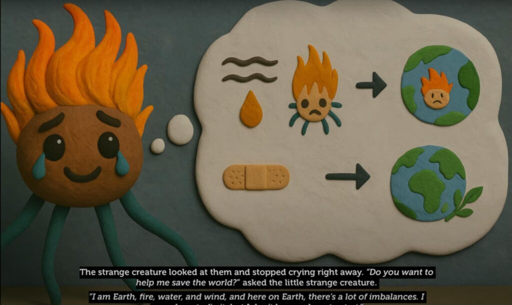 —¿Queréis ayudarme a salvar el mundo? Soy Tierra, Fuego, Agua y Viento. En este planeta hay muchos desequilibrios. Vine a arreglarlo, pero no sé por dónde empezar.