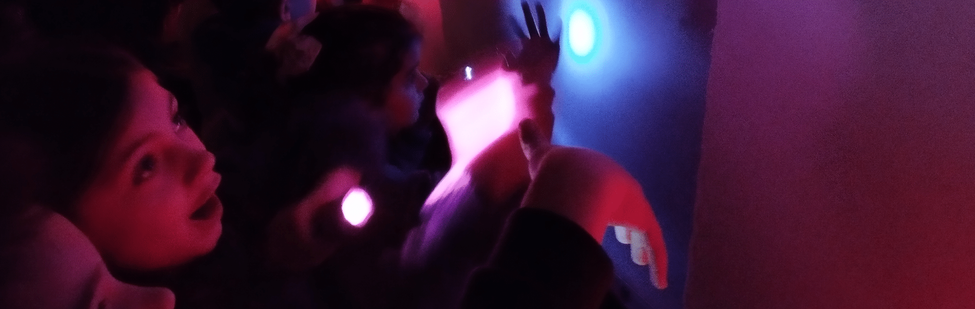 El taller se desarrolló en un ambiente especial, creado en un espacio parcialmente oscurecido, utilizando linternas y filtros de colores. Esta atmósfera mágica permitió a los niños experimentar y jugar con las mezclas de colores luz, descubriendo las diferencias con las mezclas de pigmentos y disfrutando del asombro que estos efectos producen en sus sentidos.