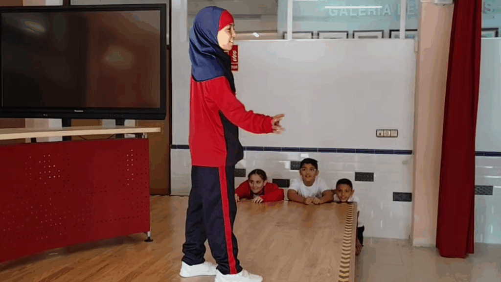 Durante la sesión, el aula se transformó en un espacio de invención colectiva. A través de dinámicas teatrales y del uso de una gran ruleta como elemento central, niños y niñas se adentraron en la creación de historias sin guion previo. El arte escénico se convirtió así en una herramienta para pensar rápido, aceptar propuestas ajenas y construir relatos compartidos, donde cada aportación encontraba su lugar.
