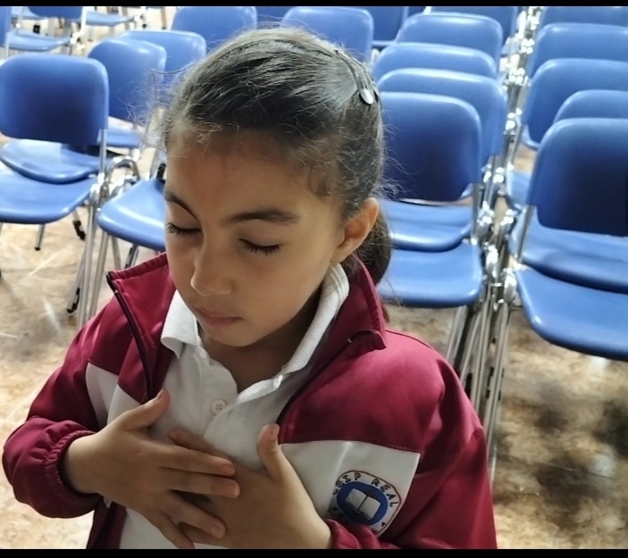 En la imagen, una niña está en meditación con las manos apoyadas en el corazón. «La meditación en niños ofrece múltiples beneficios, como la mejora de la concentración, la reducción del estrés y la ansiedad, y el fomento de la autorregulación emocional. Esta práctica ayuda a los niños a desarrollar una mayor conciencia de sí mismos y a gestionar sus emociones de manera saludable. Además, promueve la calma y el bienestar general, creando un ambiente positivo tanto en el aula como en la vida diaria,» comenta.