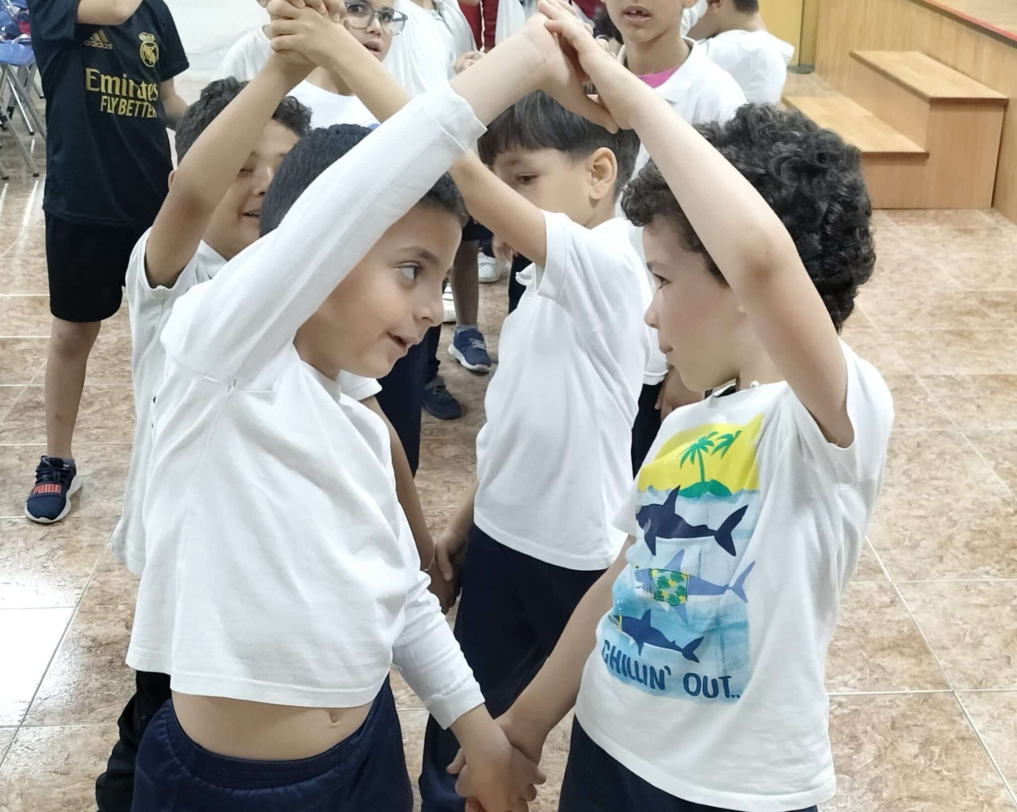 En la imagen, los niños y niñas han formado dos filas, dándose las manos para crear un puente humano mientras realizan posturas de equilibrio. Esta actividad, además de ser muy divertida, fortalece el equilibrio y la coordinación. «Promueve el trabajo en equipo y la cooperación, ya que los niños deben confiar y apoyarse mutuamente para mantener la estructura del puente. La experiencia fomenta un sentido de comunidad y conexión entre los participantes,» explica Gaitán.