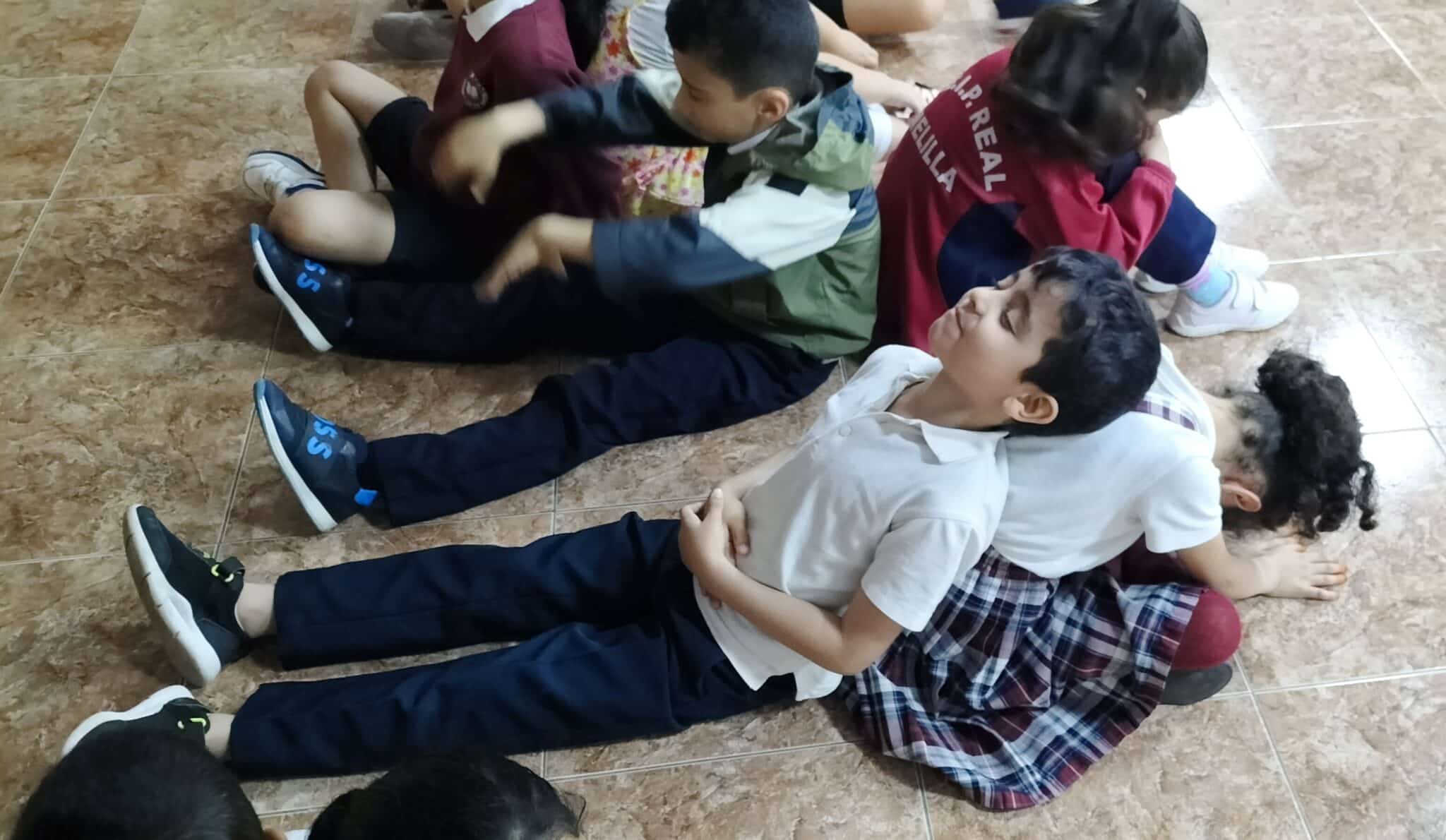 Aquí los alumnos están tumbados en fila con las espaldas apoyadas unos contra otros, formando un tren, mientras se dan masajes en la cabeza. «Este ejercicio no solo fomenta la relajación y reduce el estrés, sino que también fortalece los lazos de confianza y camaradería entre los niños. A través del contacto físico y el cuidado mutuo, los participantes desarrollan una mayor conciencia de la importancia del bienestar de los demás, promoviendo un ambiente de cuidado y apoyo emocional en el grupo,».