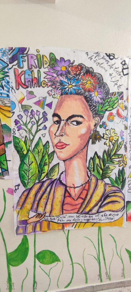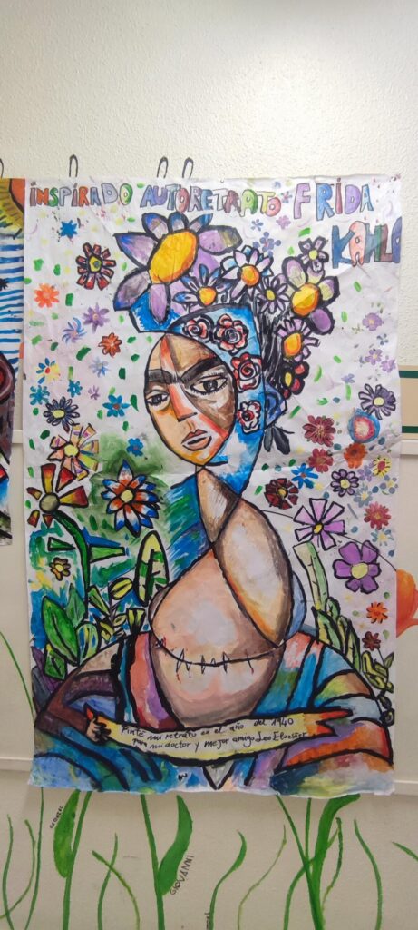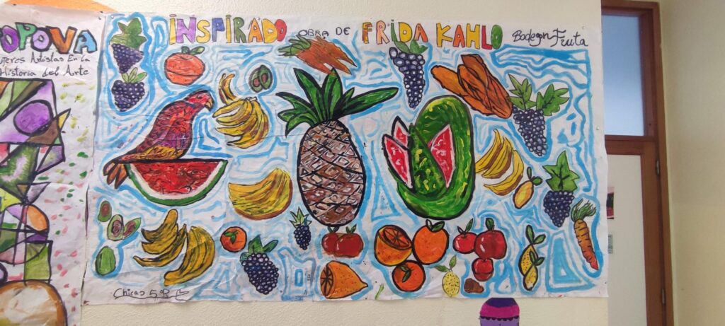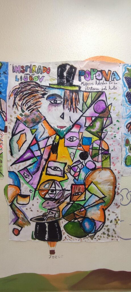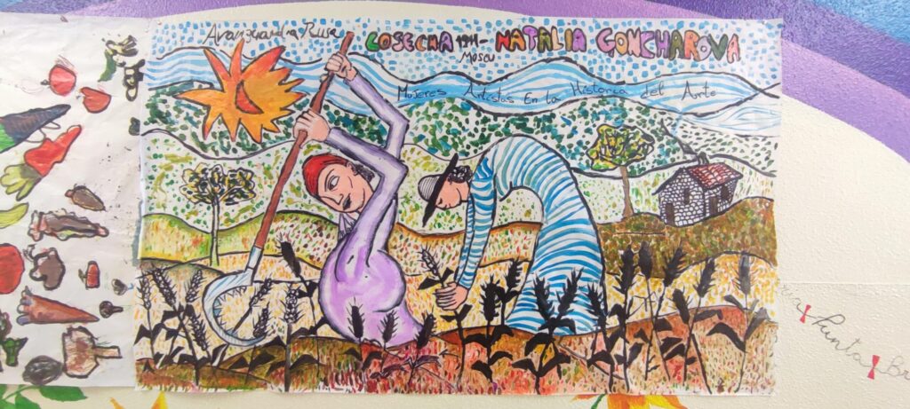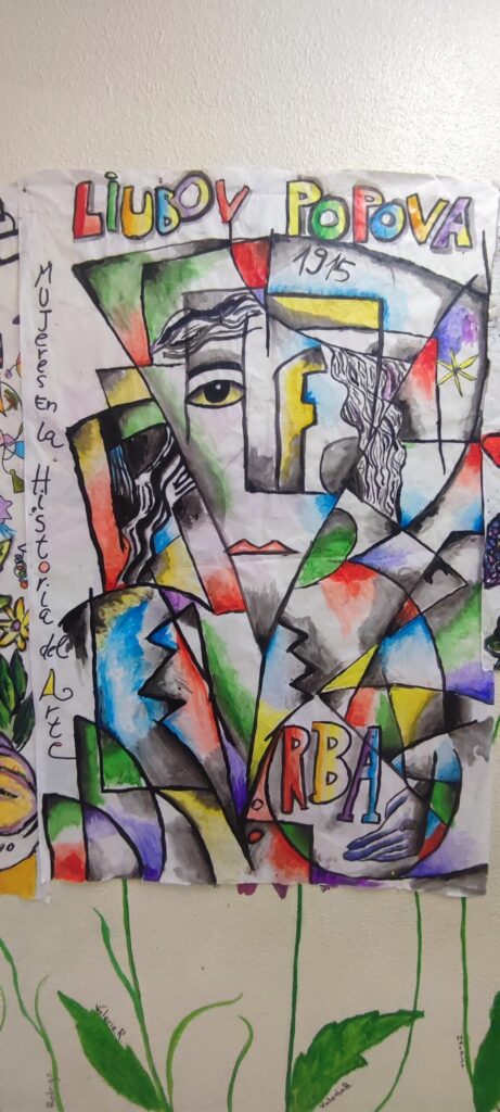 Después, los estudiantes pasaron a una fase práctica: cada uno elaboró un boceto individual utilizando elementos propios de las artistas estudiadas. Con técnicas mixtas, estos bocetos se convirtieron en la base para una gran obra colectiva realizada sobre papel continuo. Carboncillo, pintura acrílica y rotuladores sirvieron para dar forma a una composición grupal que combinó influencias artísticas con miradas personales.