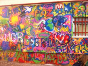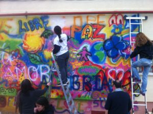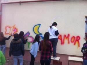 El trabajo se divide en dos momentos: el citado lunes 12 de febrero, fecha en la que se pintaba de color, de forma libre y con espráis esa fachada del centro. Y luego un segundo día en el que las familias, previa elección de una palabra o frase por parte del CEIP Lope de Vega, terminarán el mural. ¿Cuál será el resultado? Lo sabremos en breve.