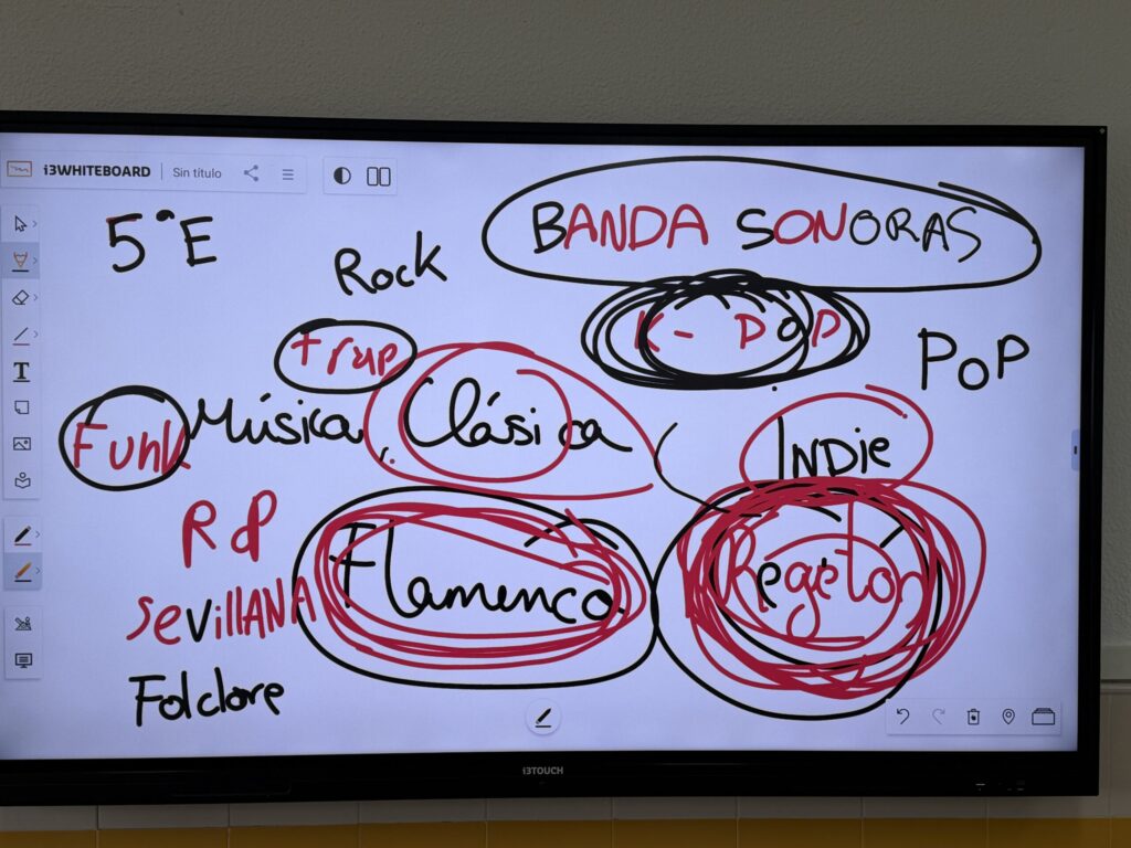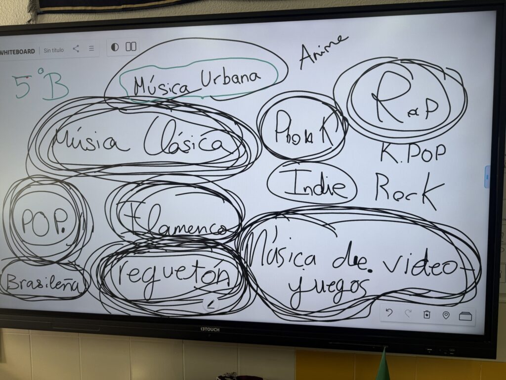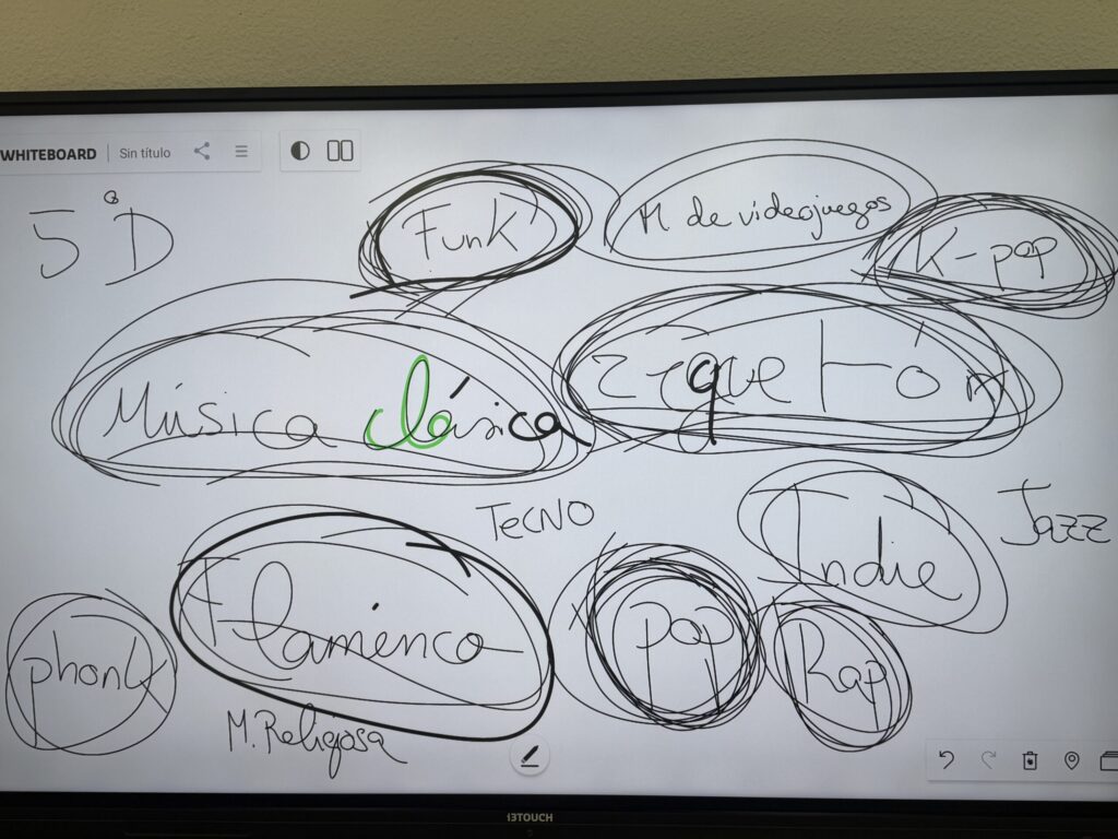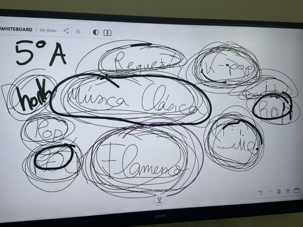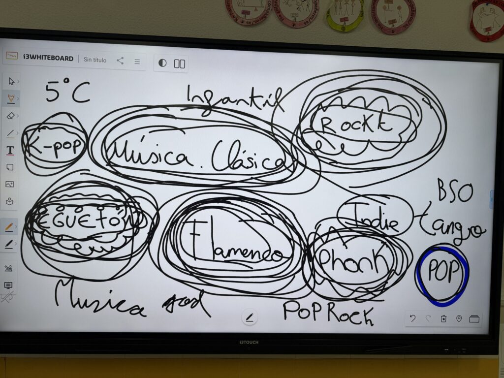 El punto de partida de la sesión fue una dinámica de análisis y puesta en común en la que cada niño y cada niña elaboró un pequeño esquema con sus estilos musicales preferidos. Esta actividad permitió abrir un espacio de diálogo, escucha y descubrimiento mutuo, donde cada persona pudo compartir aquello que le emociona y le representa musicalmente.
