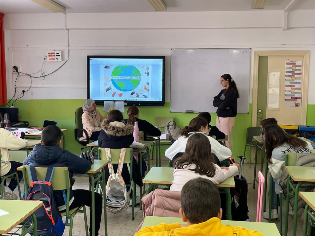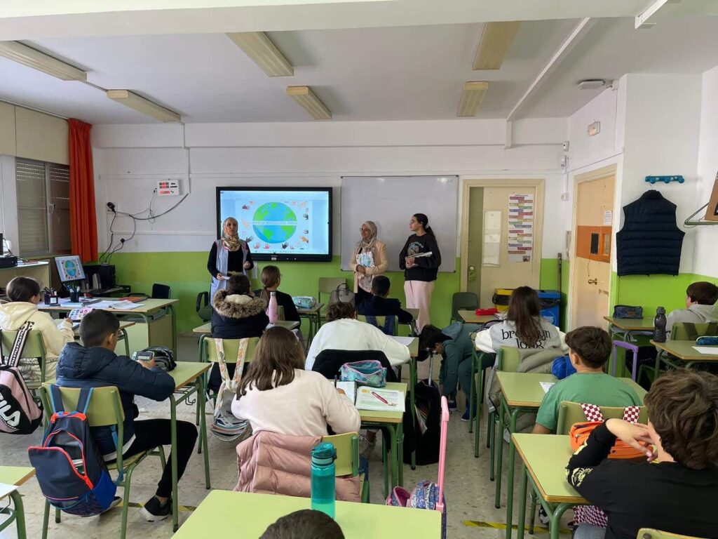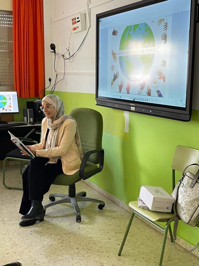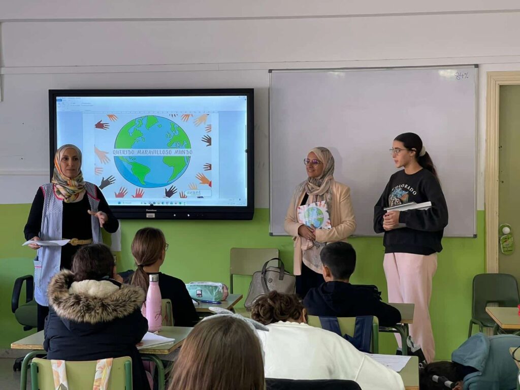 Esta mañana, Butaina Abdeljalak, profesora de religión islámica, acompañada de Ahlam (alumna de instituto) han acudido al centro a contarnos «Querido maravilloso mundo».