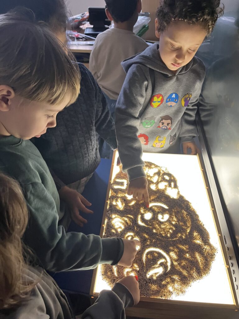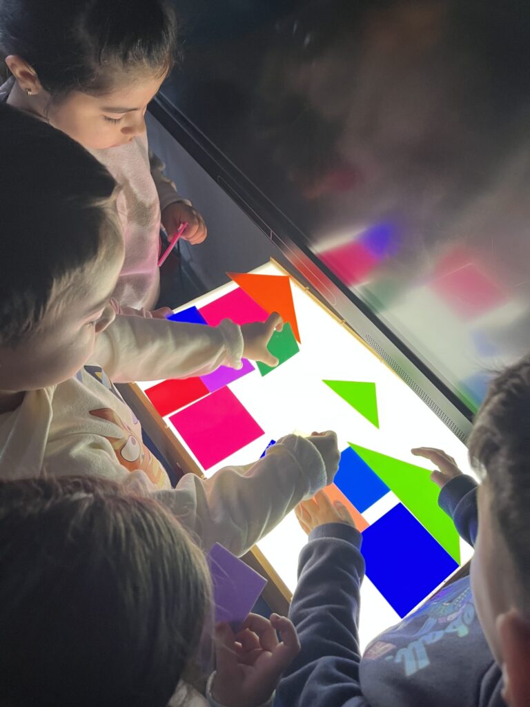 En el CEIP Francisco de Goya en Madrid, en Infantil se trabajó con juegos luminosos en mesa de luz, utilizando arena y formas geométricas de metacrilato. A partir de ese juego, se plantean construcciones de espacios de palacio y un primer acercamiento a cómo la luz transforma lo que vemos y lo que imaginamos.