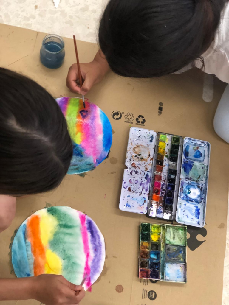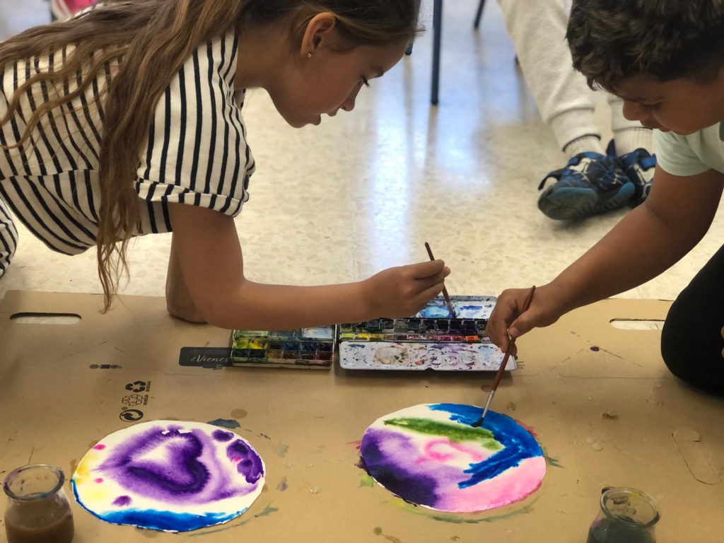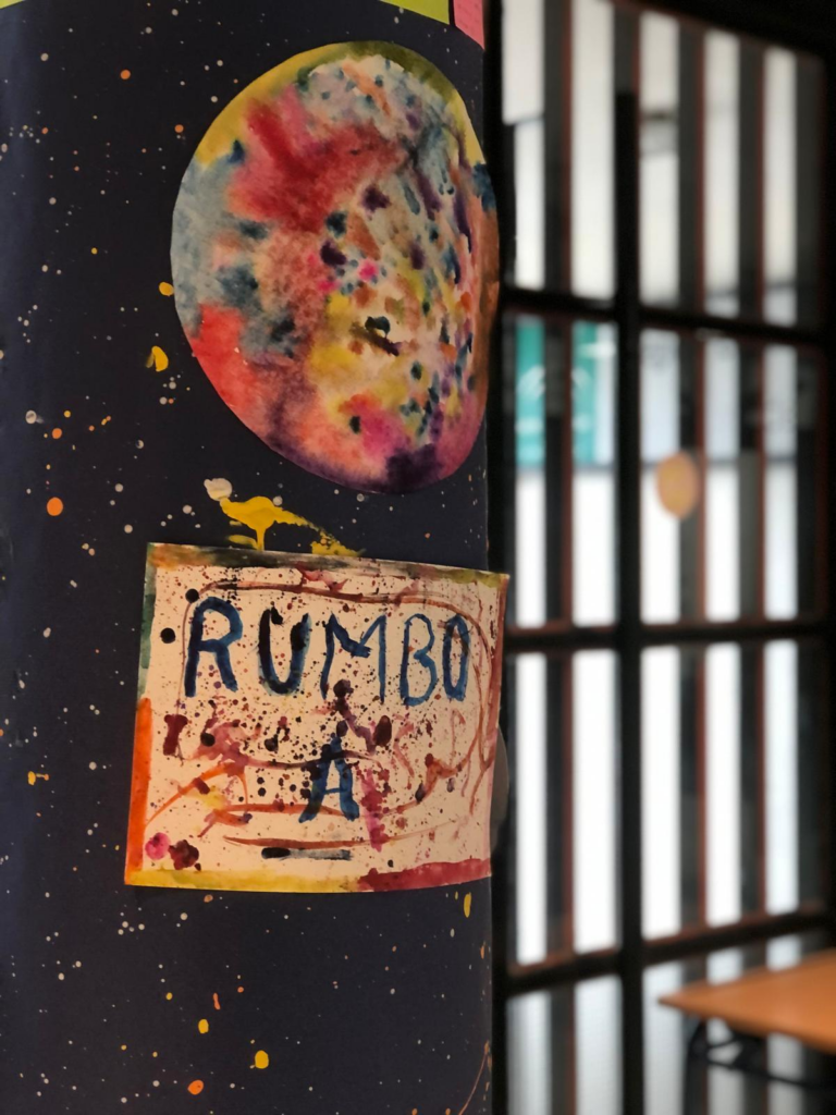 El trabajo se completó con una actividad de experimentación plástica. Cada niña y cada niño utilizó acuarelas para crear planetas lejanos, dando forma a sus propias visiones de otros lugares posibles. A lo largo del proceso, también se implicaron en el montaje colectivo de una instalación artística que ahora ocupa el recibidor del centro.