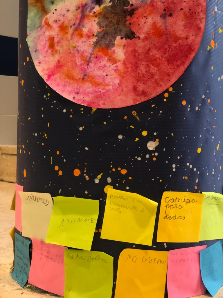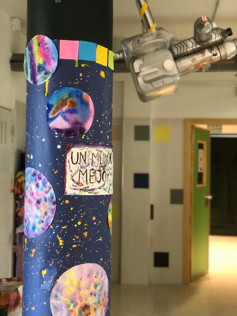 El alumnado de primaria ha dado forma a unas singulares naves espaciales, que les han llevado a conocer los ODS 2030 y pensar en cómo podría ser este mundo un poquito mejor. Además han experimentado con acuarela para pintar planetas lejanos y han colaborado en el montaje de la instalación. Desde los 6 años ya va estando claro: Este mundo necesita entre otras cosas, que no haya guerra, más plantas, más cuidado a las personas y los animales, menos basura, y por supuesto, que nadie pase hambre.
