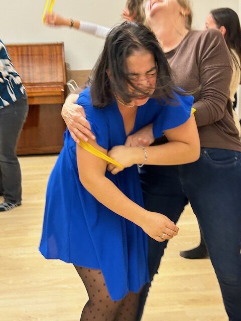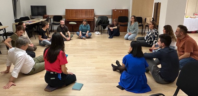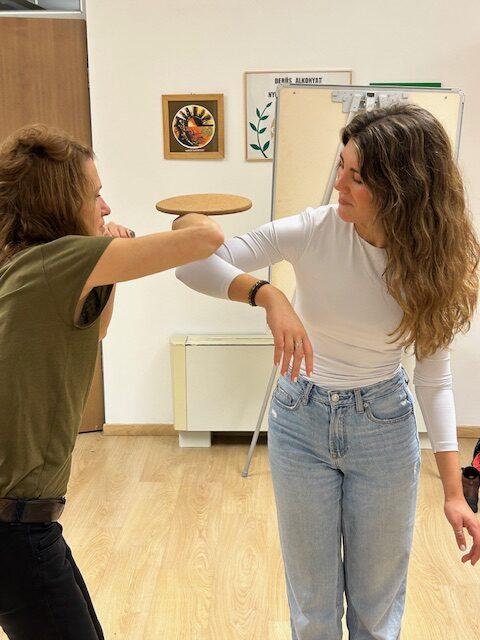 Los artistas húngaros Réka Horváth y Ákos Gubinecz desarrollaron una sesión práctica desde la expresión corporal, la danza y la música con los docentes y artistas de Hungría, España, Portugal y Alemania, compartiendo técnicas de trabajo que luego podrán aplicar en sus aulas. A través de dinámicas vivenciales, el grupo exploró cómo estas sesiones pueden favorecer la participación activa de niños y niñas, reforzar la confianza y abrir espacios seguros donde abordar los temas de identidad, raíces y pertenencia que atraviesan el proyecto.
