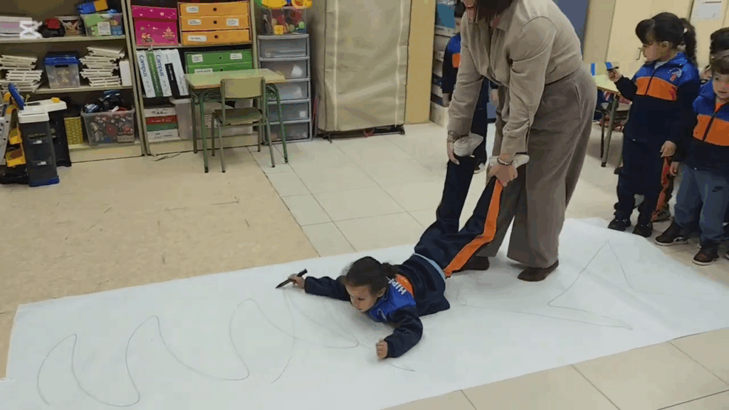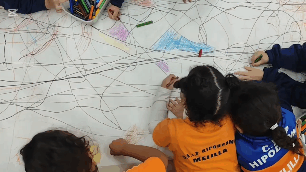 Esa idea encuentra una traducción concreta en el trabajo realizado en el CEIP Hipódromo de Melilla junto a María Mansilla, artista de artes escénicas. En esta ocasión, niños y niñas del centro han creado un mural abstracto a partir de una propuesta en la que el cuerpo ha pasado a formar parte directa del proceso plástico.