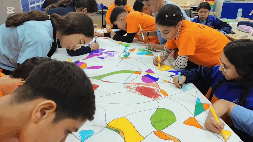 El trabajo plástico tiene un valor claro dentro del ámbito escolar: permite pensar con las manos, con el gesto y con la materia. Pintar, trazar, arrastrar color o construir una superficie común no sólo da lugar a una obra, también abre un proceso de relación, decisión y expresión. En esta línea de trabajo, recordamos que nuestro fundador, Yehudi Menuhin, deseaba que el arte y la cultura desempeñaran un papel destacado en la sociedad, y que subrayara el papel de las artes en la integración.