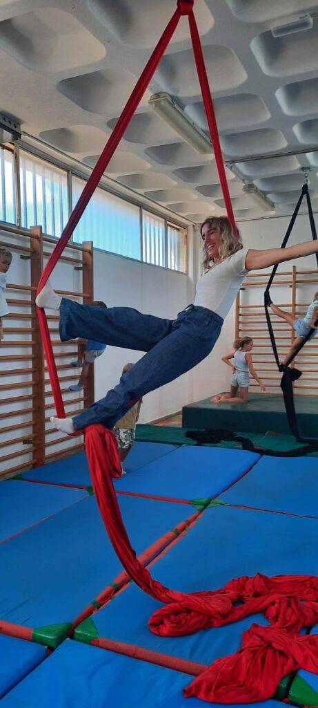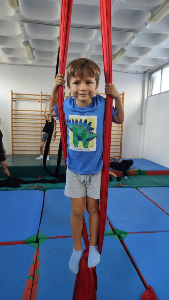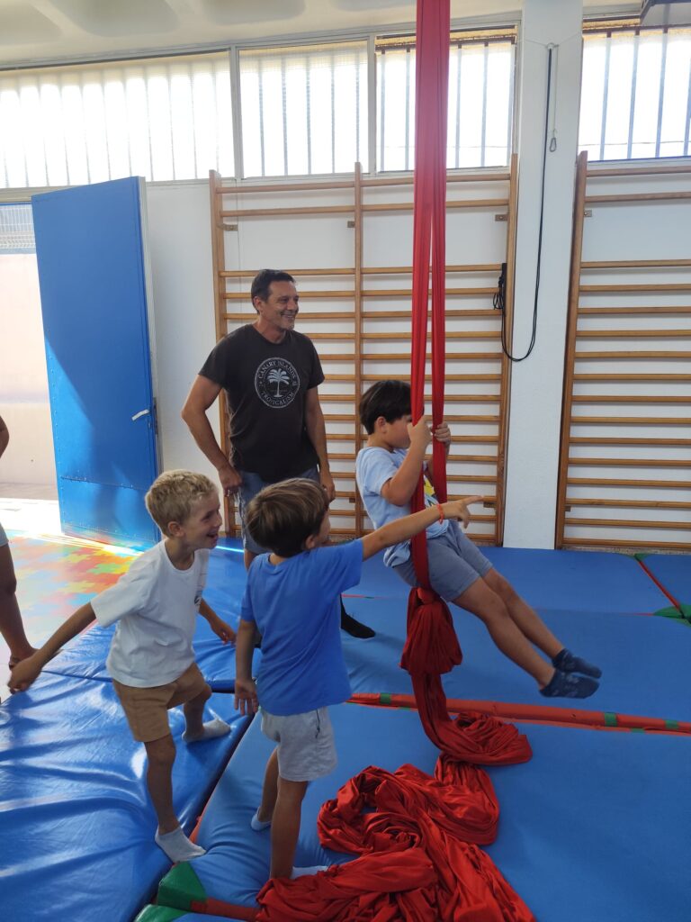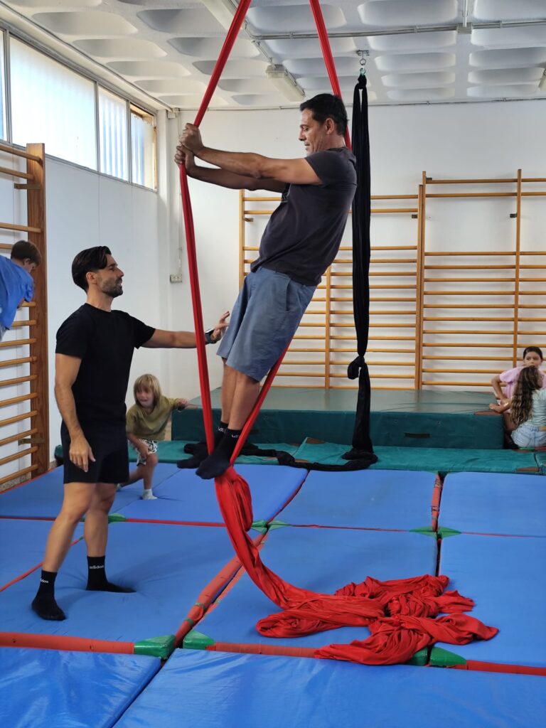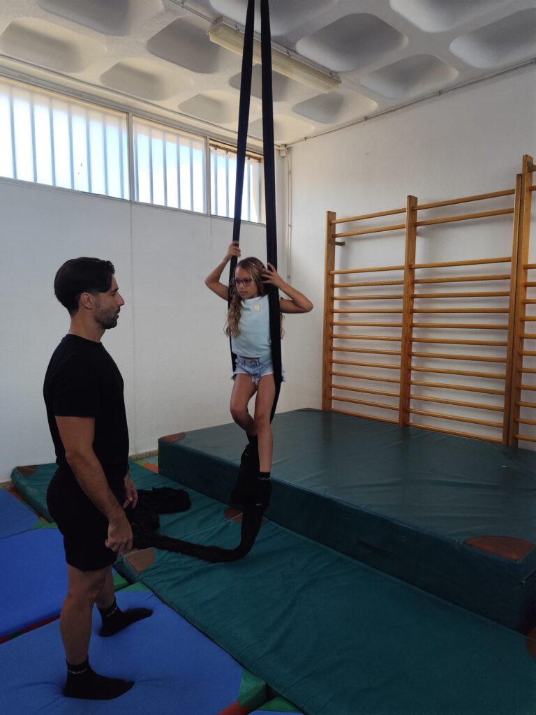 La propuesta, basada en el trabajo con telas, permitió explorar el cuerpo en suspensión, el equilibrio y la coordinación, siempre desde una aproximación cuidada y progresiva. A través de esta disciplina artística, el grupo pudo experimentar cómo el arte del movimiento no solo desarrolla habilidades físicas, sino que también invita a confiar, esperar turnos y comunicarse de forma clara. ¿Qué ocurre cuando el cuerpo se convierte en lenguaje y el grupo sostiene el proceso? La respuesta se fue construyendo a lo largo de la sesión, gesto a gesto.