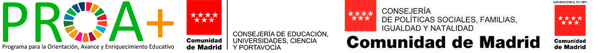Esto ha sido posible gracias al Programa PROA+, a la Consejería de Educación, Universidades, Ciencia y Portavocía de la Comunidad de Madrid, a la Consejería de Políticas Sociales, Familias, Igualdad y Natalidad de la Comunidad de Madrid y a la Subvención del 0.7% de la Comunidad de Madrid.