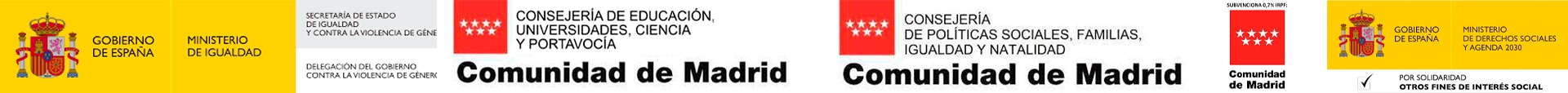 Estas sesiones han sido posible gracias al Ministerio de Igualdad del Gobierno de España, a la Consejería de Educación, Universidades, Ciencia y Portavocía de la Comunidad de Madrid, a la Consejería de Políticas Sociales, Familias, Igualdad y Natalidad de la Comunidad de Madrid, a la Subvención del 0.7% de la Comunidad de Madrid y a la participación del Ministerio de Derechos Sociales y Agenda 2030 a través de su convocatoria del 0,7%.